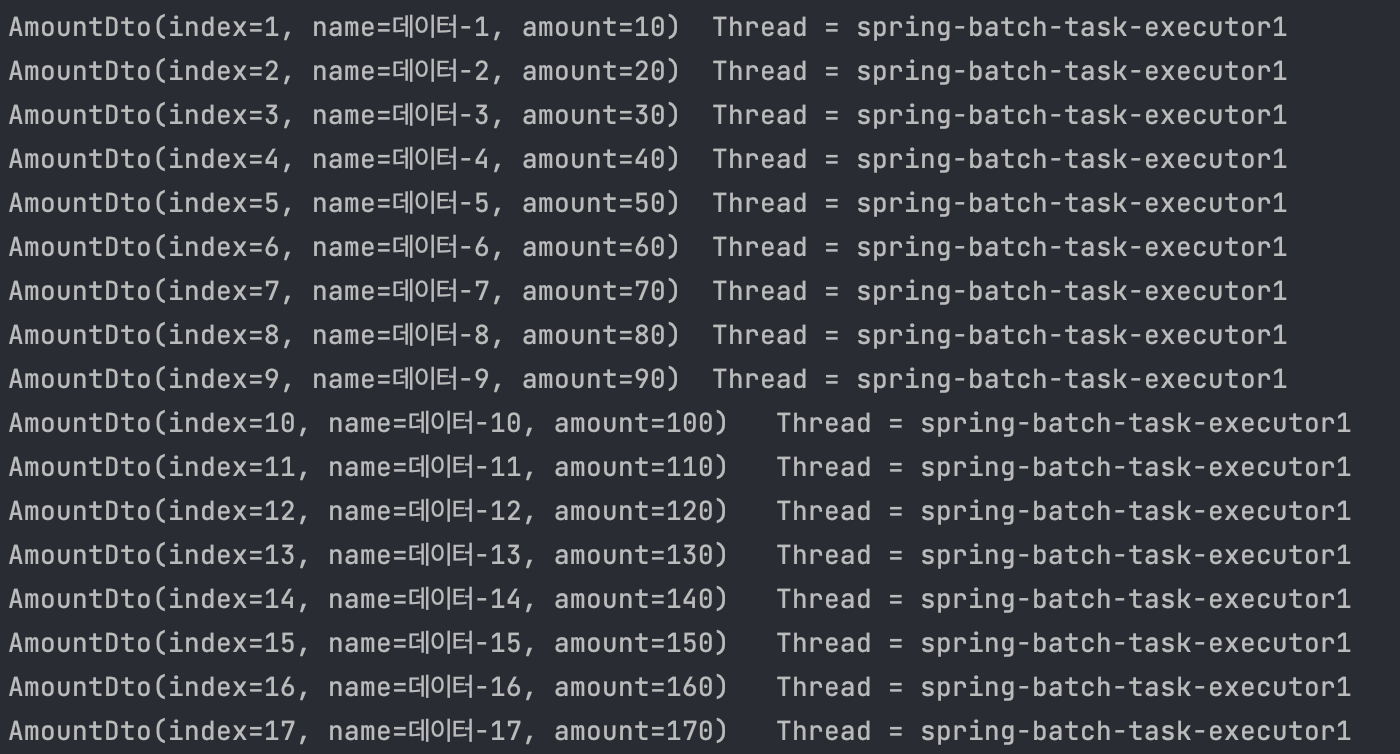 단일 스레드로 진행하는 배치 로직은 다음과 같이 작성할 수 있다. 해당 폼을 기본으로 하고 멀티 스레드를 TaskExecutor를 작성해 설정할 수 있다.