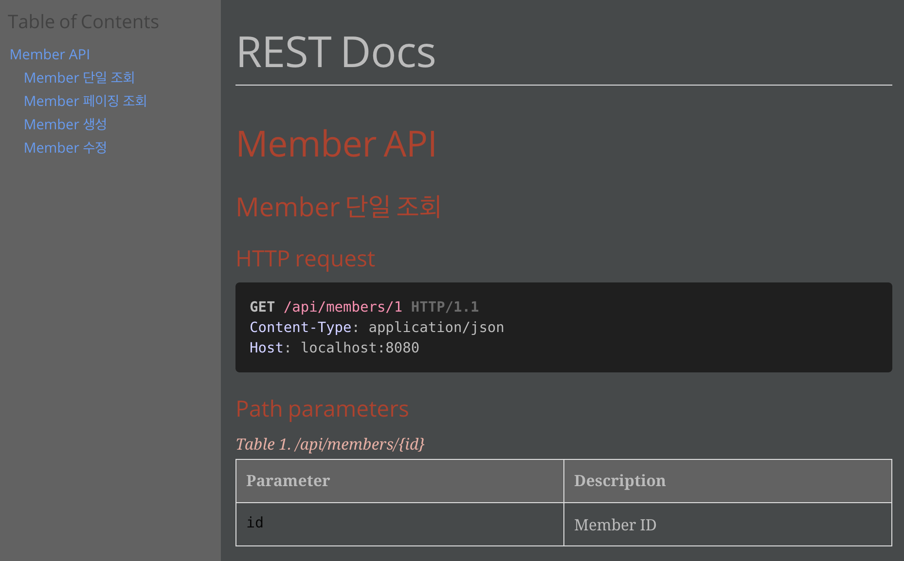 pathParameters 메서드는 엔드포인트의 경로 변수에 대한 문서화를 정의한다. parameterWithName("id").description("Member ID")는 id라는 경로 변수에 대한 설명을 추가하는 것을 나타낸다.