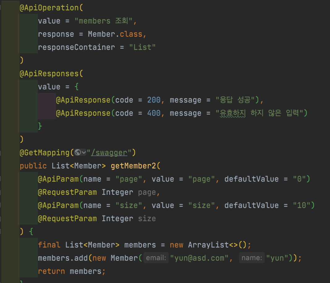 Swagger는 Api에 대한 명세 기능을 제공하면서도 호출에 좀 더 초점을 맞추고 있다. 또한 Swagger는 애노테이션 기반으로 구성해야 한다. 예를 들면 다음과 같은 방식이다.