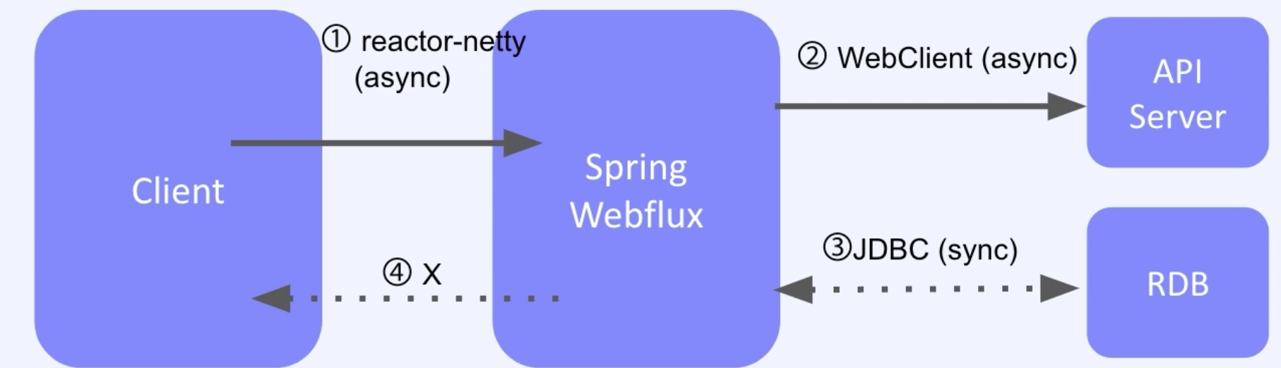 2번 부분까지 보았을 3번 db 커넥션 부분에서 jdbc 혹은 orm을 사용하면, 1번 2번이 비동기로 처리하더라도 3번을 동기로 처리하면 3번 응답이 올 때까지 해당 스레드는 4번까지 처리를 못하고 기다리게 된다.