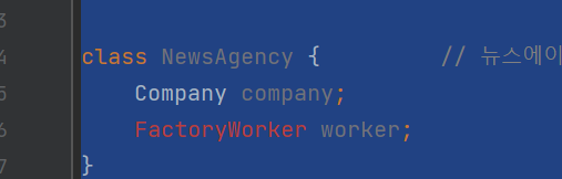 class NewsAgency { // 뉴스에이전시는 회사를 인터뷰하고자 한다 / 하지만 컴패니는 뉴스에이전시가 FactoryWorker와는 인터뷰하지 않기를 바란다 / Factoryworker는 일만하길 바란다