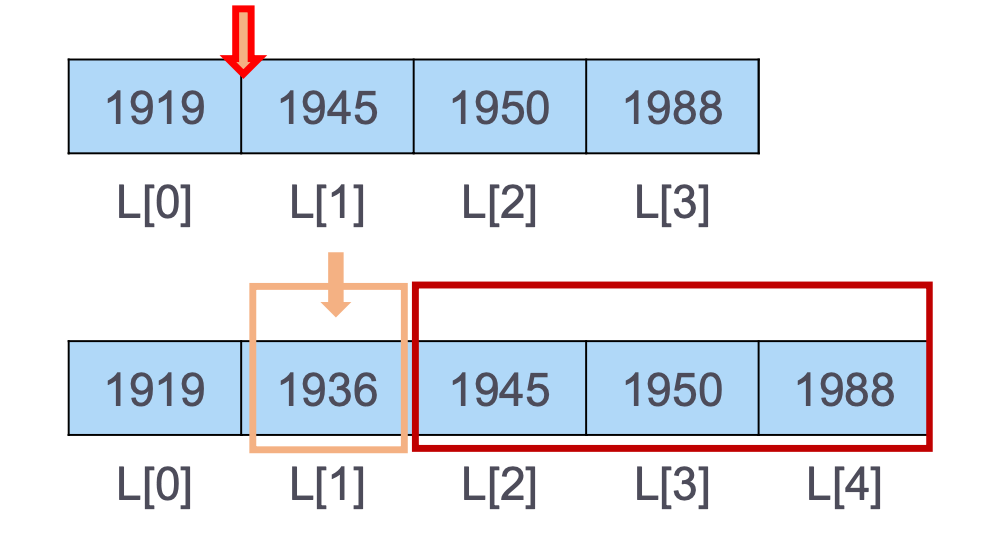 원소 삽입 과정은 배열의 중간에 새로운 요소를 추가하고자 할 때, 그 위치 이후의 모든 요소를 오른쪽으로 이동시켜야 한다. 이는 상당한 연산 부담을 초래할 수 있다. 예를 들어, 1936년의 애국가 작곡을 기존의 역사적 사건 배열에 삽입하고자 할 때, 이후의 모든 요소들이 오른쪽으로 한 칸씩 이동해야 한다.