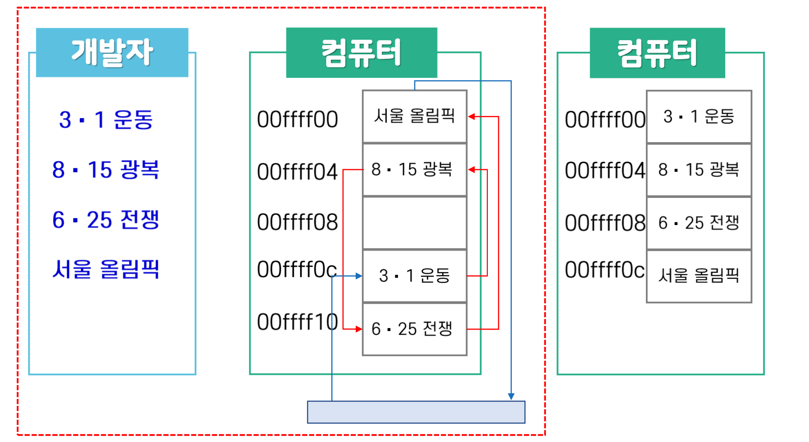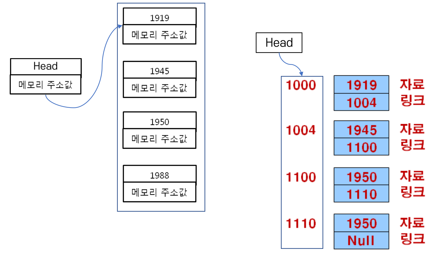 - 포인터 기반 리스트 (연결 리스트): 물리적 순서 무관, 유연한 데이터 관리 가능