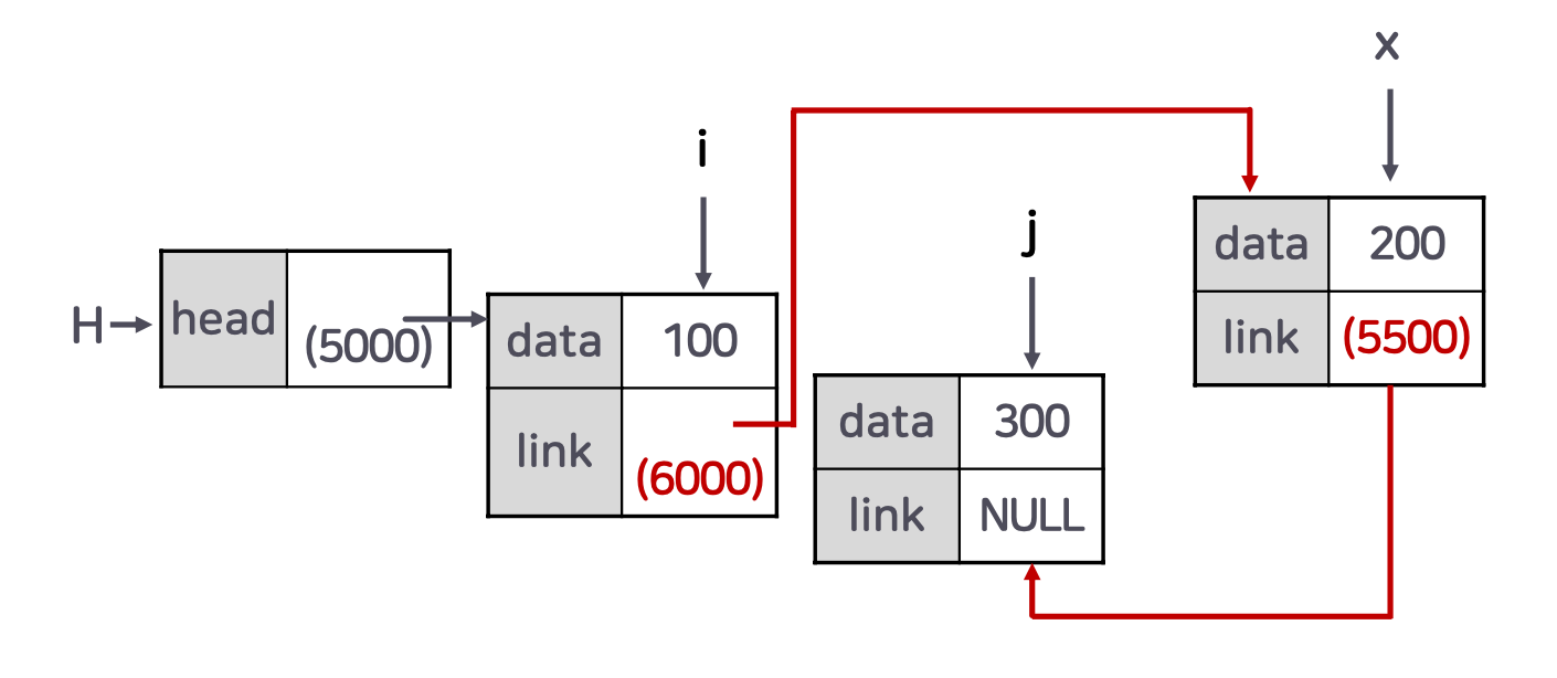 - 이전 노드의 링크를 새 노드로 변경하고, 새 노드의 링크를 다음 노드로 설정한다.