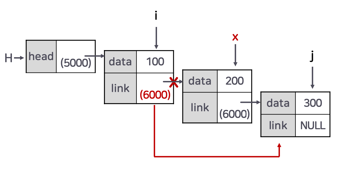 - 선행 노드의 링크를 삭제할 노드의 후행 노드로 변경한다. 이를 통해 연결 리스트에서 삭제할 노드를 '건너뛰게' 한다.