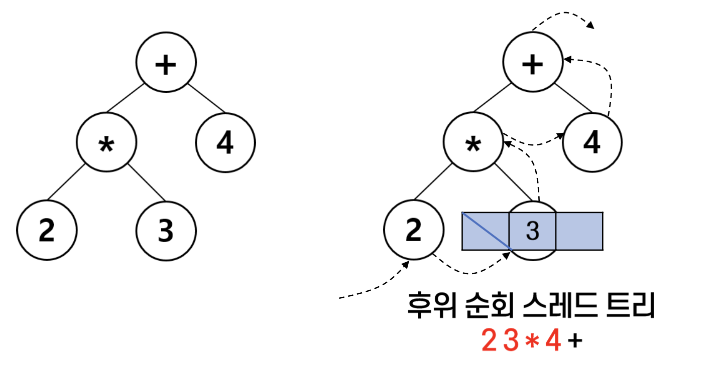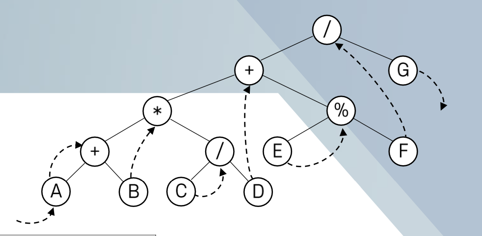 - 순회 예시: 예를 들어, 교재에서 노드 '/', '+', '', '+'는 실제 자식 노드를 가리키는 반면, 노드 'A'와 'B'는 각각 노드 '+', ''를 가리키는 스레드를 사용한다. 마지막 방문 노드인 'G'의 오른쪽 포인터는