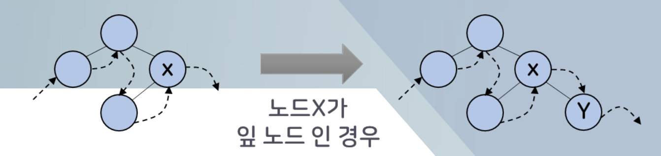 null로 설정하고, 오른쪽 포인터는 삽입 위치에 있는 노드의 오른쪽 포인터를 가리킨다. - 삽입할 노드의 왼쪽 스레드 포인터에는 삽입 위치의 노드 주소를 저장하고, 오른쪽 스레드 포인터는 삽입 위치의 노드 오른쪽 스레드에 저장한다.