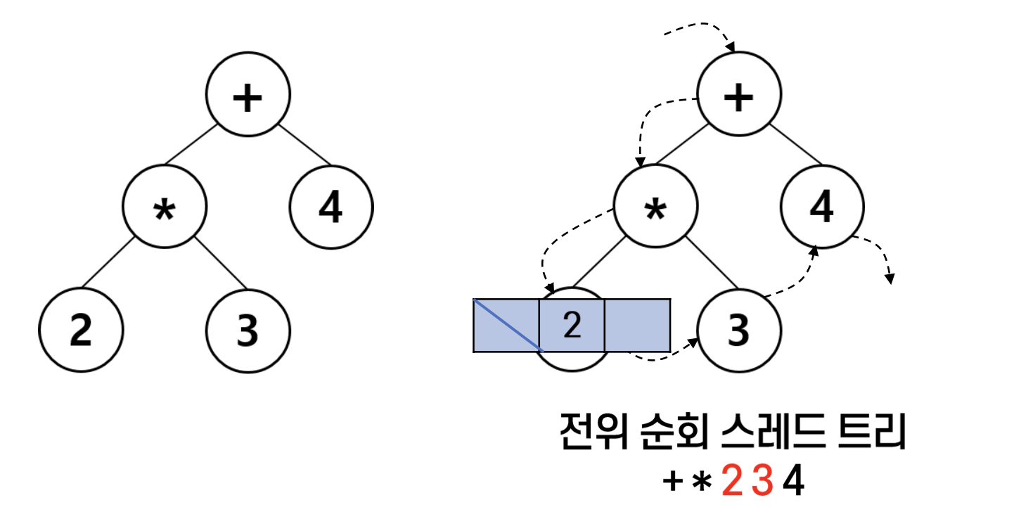 - 오른쪽 스레드는 정해진 순회 순서에 따른 그 노드의 후속 노드를 가리키고, 왼쪽 스레드는 그 노드의 선행 노드를 가리킨다.
