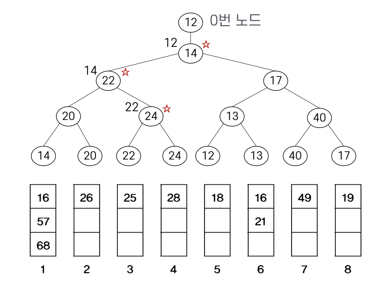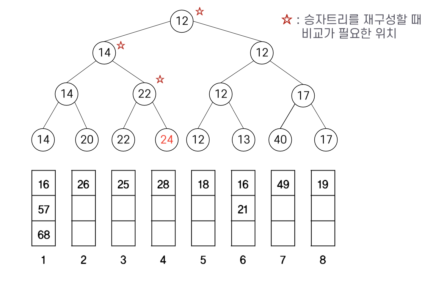 - 승자 트리 구축 과정은 작은 값이 승자로 올라가는 토너먼트 경기와 유사하다. 즉 트리의 각 내부 노드는 두 자식 노드 값의 승자를 자신의 값으로 한다.