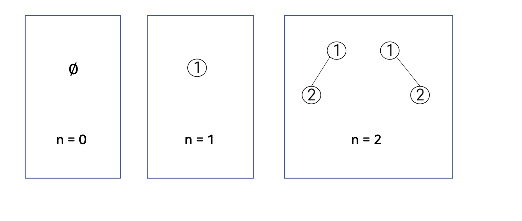 노드 개수가 0인 이진 트리는 몇개나 있을까? 1개이다. 아무것도 없는 그 트리이다. 그럼 노드 개수가 1인 이진트리는 몇개일까? 마찬 가지로 1개이다. 이제 노드가 2인 경우를 생각해보자. 노드가 개수가 2인 이진트리는 다음과 같이 2개이다.