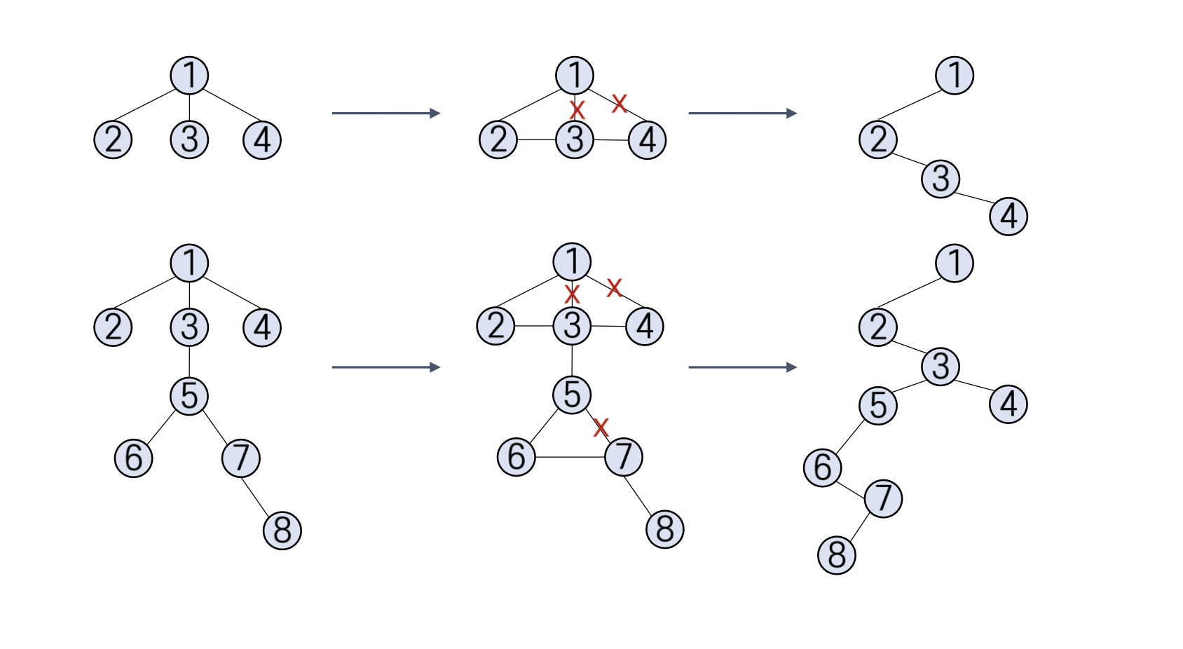 숲을 이진 트리로 변환하는 과정은 간단하면서도 중요한 원리에 기반한다. 각각의 트리(Ti)를 먼저 이진 트리(BTi)로 변환한 다음, 이를 하나의 이진 트리로 결합한다. 이 과정에서 중요한 것은 각 Ti^BT의 루트가 왼쪽 서브트리만을 가지며, 이 루트를 최상위 루트로 하여 왼쪽 자식은 그 왼쪽 서브트리를, 오른쪽 자식은 나머지 트리들의 이진 트리(BT2~n)로 구성하는 것이다.