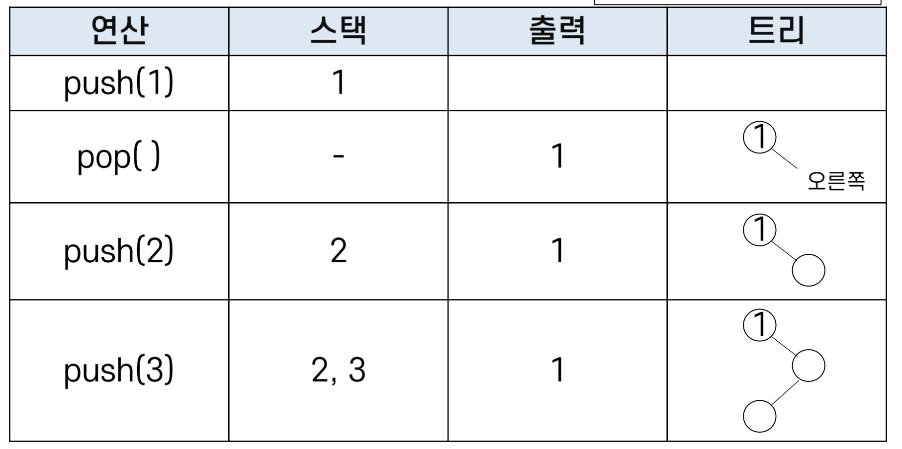 전위 순회 방문 순서가 1,2,3 이고 중위 순회 방문 순서가 1,3,2라고 하자. 1,2,3을 위와 같이 스택에 넣었다 빼면 1,3,2를 얻을 수 있다. push()는 트리 생성 과정으로 껍데기 노드와 왼쪽 서브트리를 나타내고, pop()은 껍데기 노드에 값을 넣고 오른쪽 서브트리로 이동하는 것으로 생각할 수 있다.