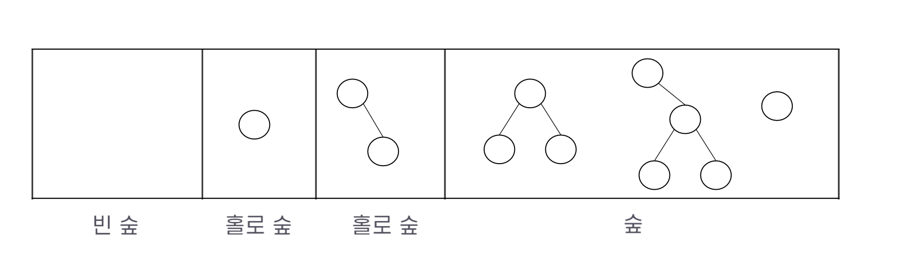 - 분리된 트리 모임을 숲이라 부르며, 숲은 n(>=0)개 이상의 분리된 트리 집합이다.