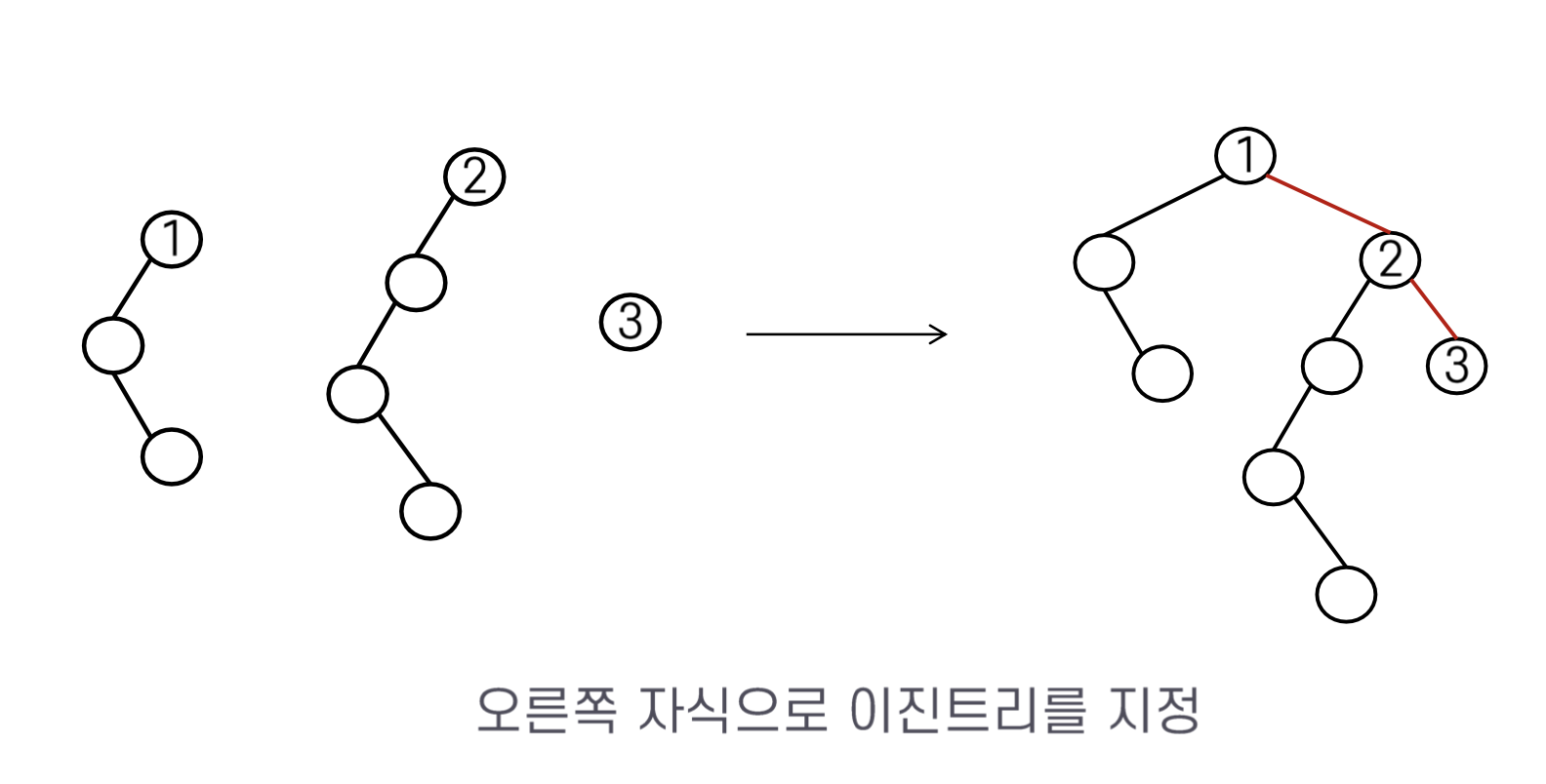 - 숲을 이진 트리로 바꾸려면 먼저 각 트리(Ti)를 이진 트리로 바꾼다(Ti^Bt). 이때 Ti^BT의 루트는 왼쪽 서브트리만 갖는다. 다음은 T1^BT의 루트를 최상위 루트로 하고 왼쪽 자식은 그 왼쪽 서브트리(오른쪽 서브트리는 없음), 오른쪽 자식은 나머지들의 이진 트리(BT2~n)가 되도록 한다.
