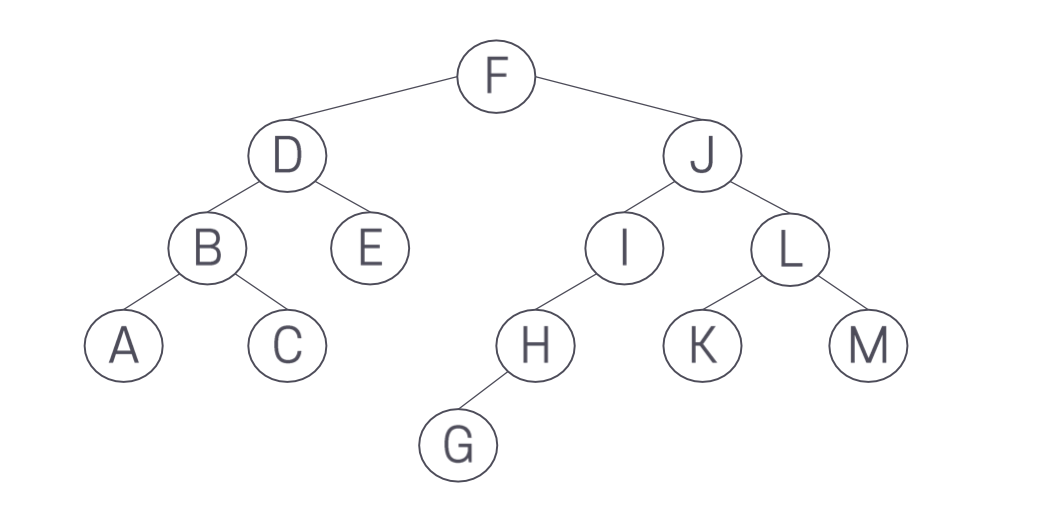 다음과 같은 그림에서 원 안의 알파벳이 해당 노드의 키값이다. 예를 들어 "루트 노드의 키값은 B이고 왼쪽 자식 노드의 키값은 A이다"라고 표현할 수 있는 것이다. 그러면 이 이진 트리는 위 조건을 만족하는 BS 트리이다.