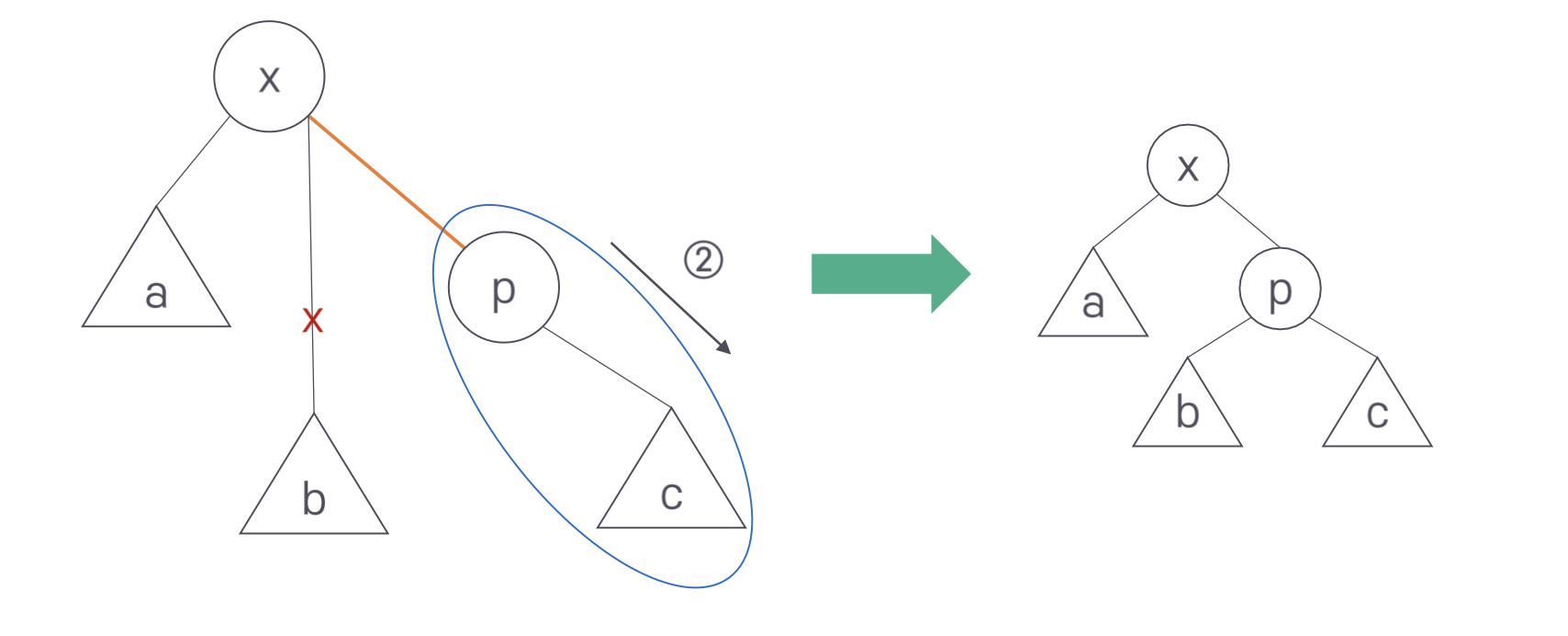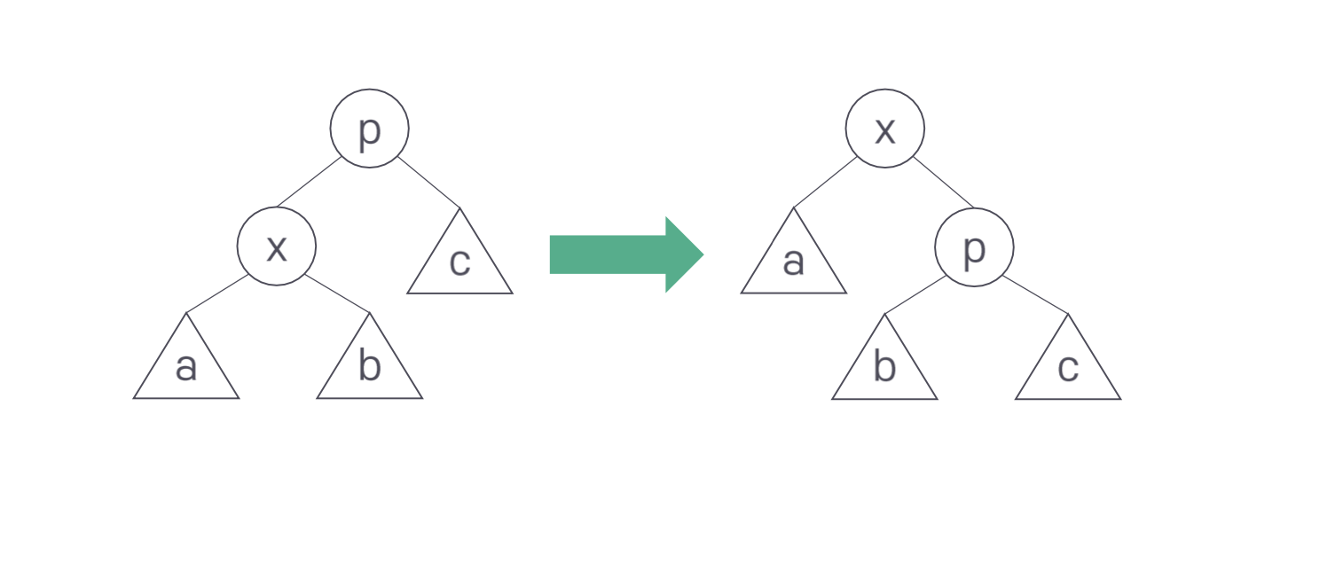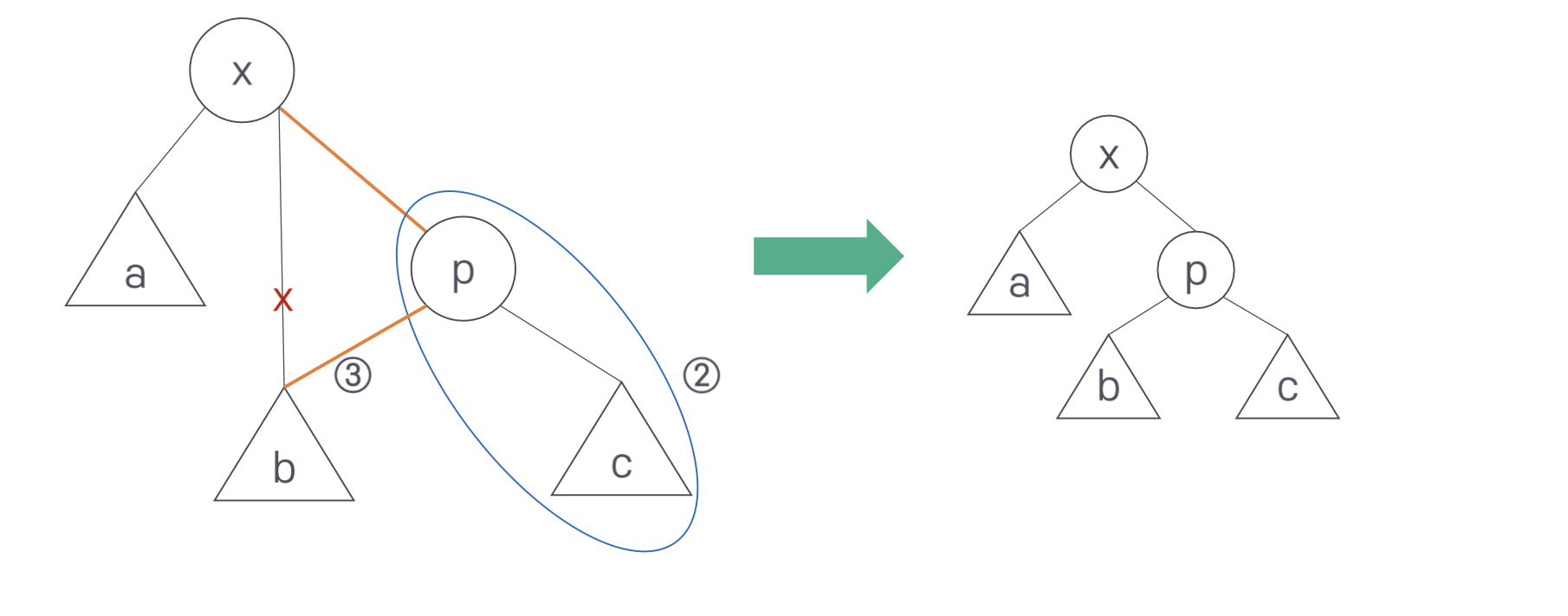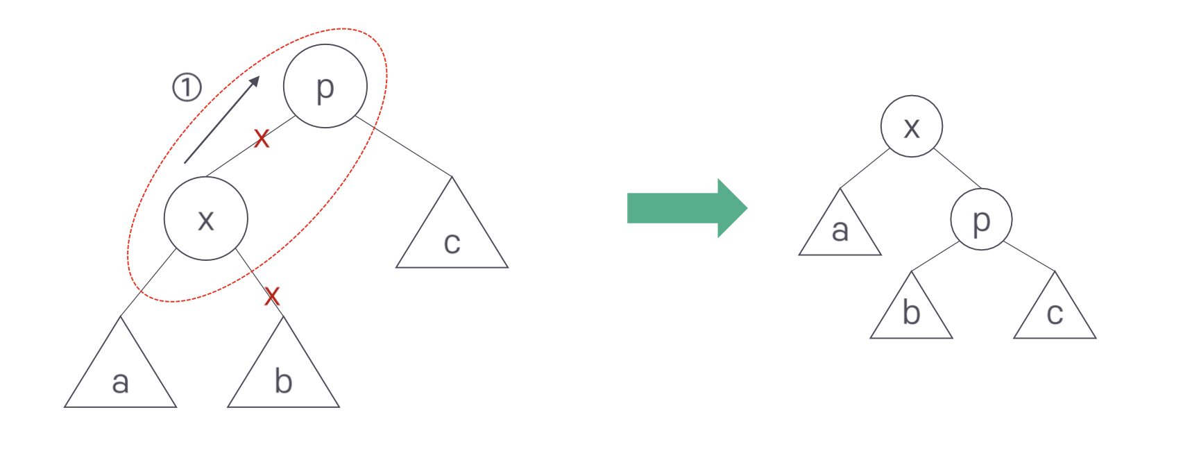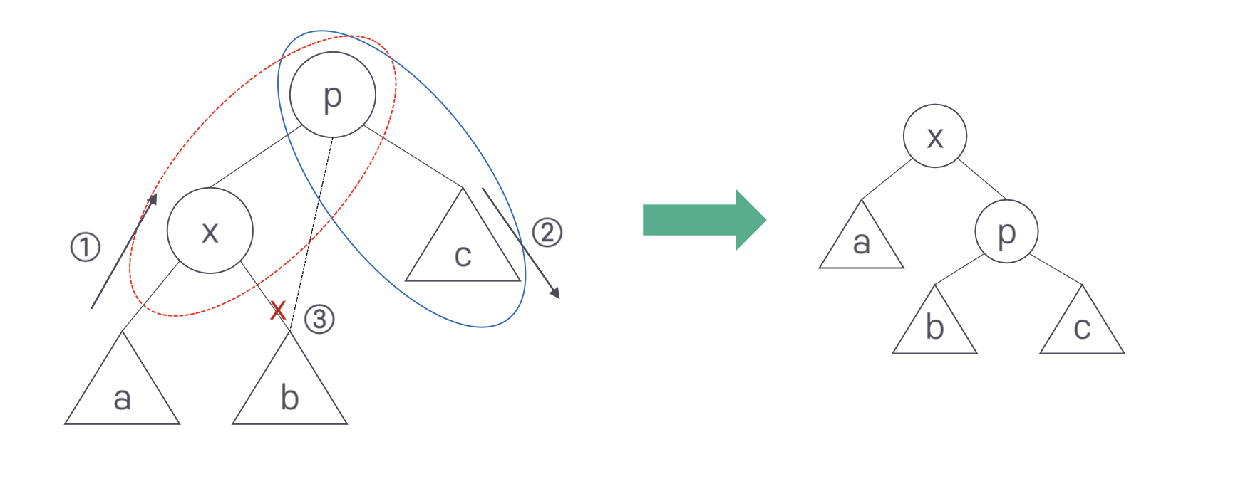 회전은 3단계로 진행된다. 먼저 x-a가 p-x 자리로 올라간다. 이때 서브트리 b는 연결이 끊어진다. 대신 p-c가 오른쪽 아래로 내려간다. 이때 전 단계에서 올라온 x와 p를 연결한다. 마지막으로 첫 단계에서 연결이 끊긴 서브트리 b를 p의 왼쪽 서브트리로 연결한다.