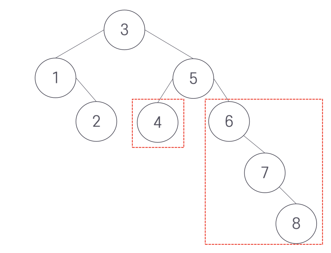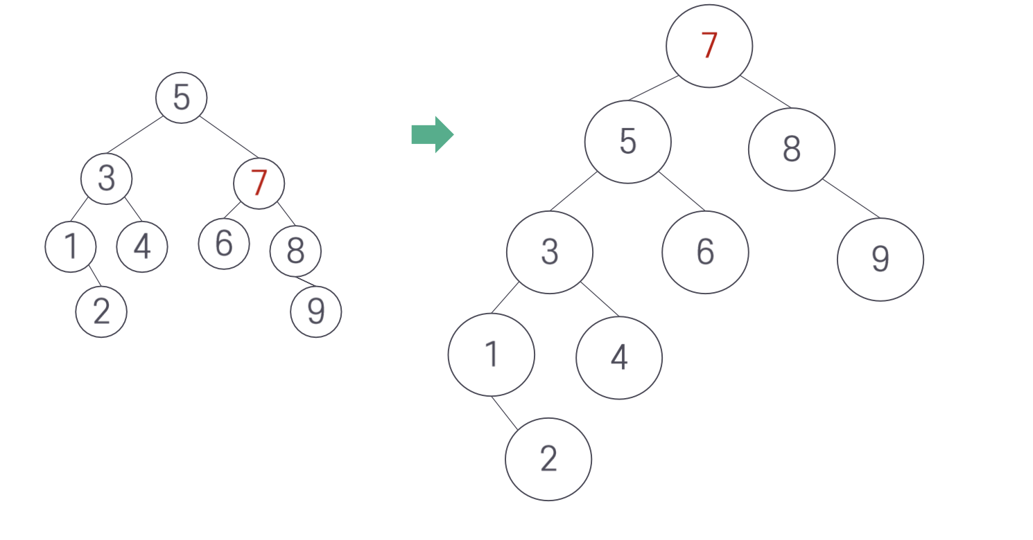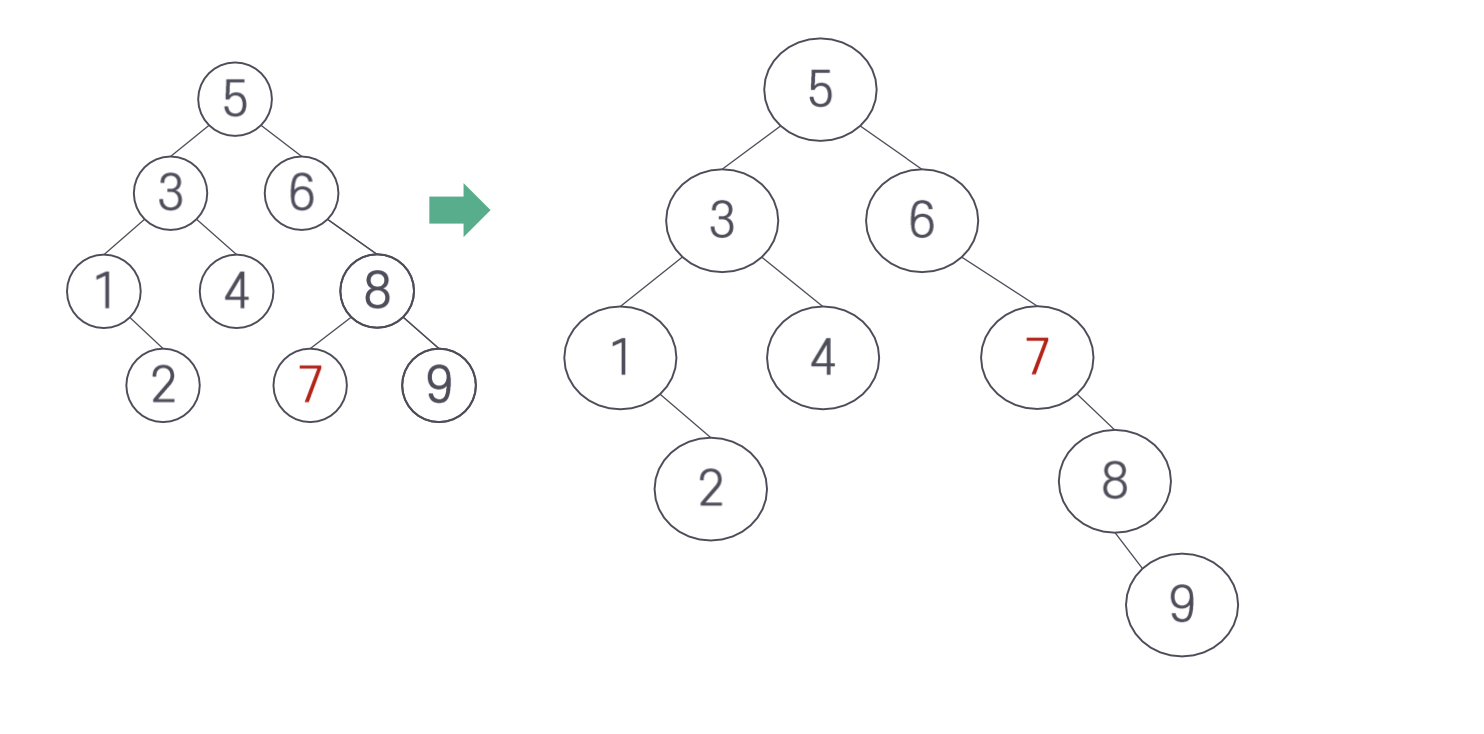}BS 트리에서 삭제하려는 노드가 잎이 아닌 경우 그 노드의 서브트리를 유지해야 하므로 삭제 과정 역시 복잡하다.