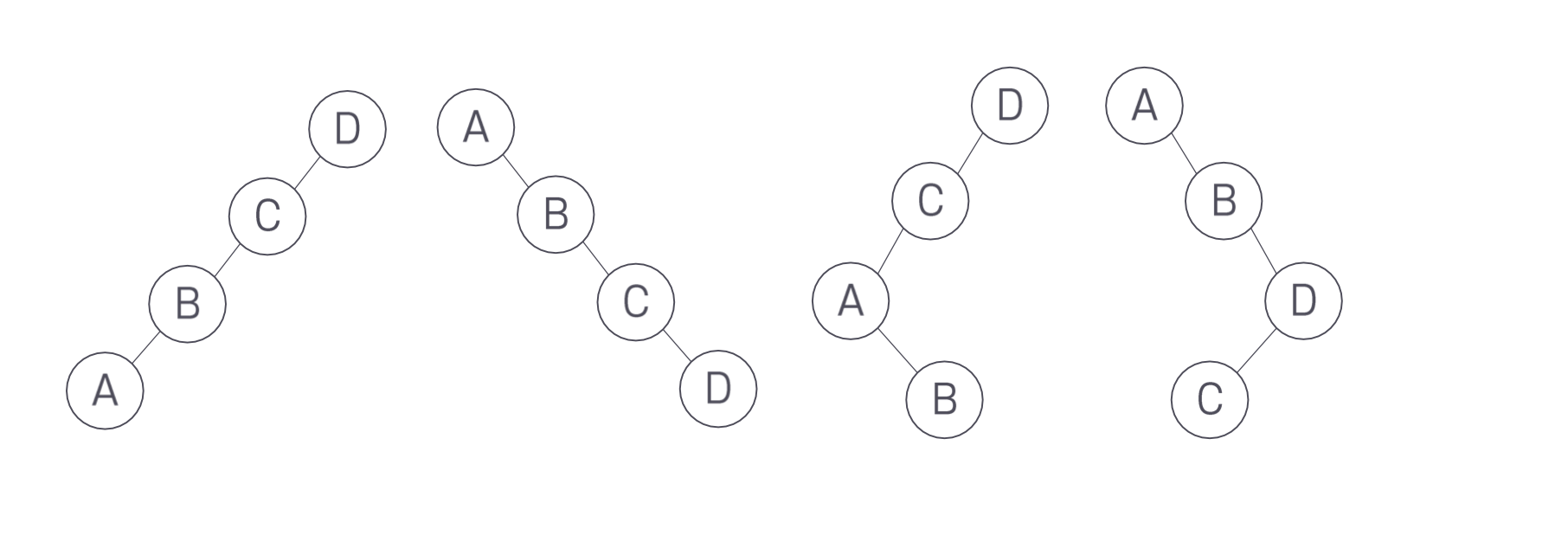 다음과 같이 순서 데이터 A, B, C, D를 유지하는 다른 BS 트리가 가능하다.