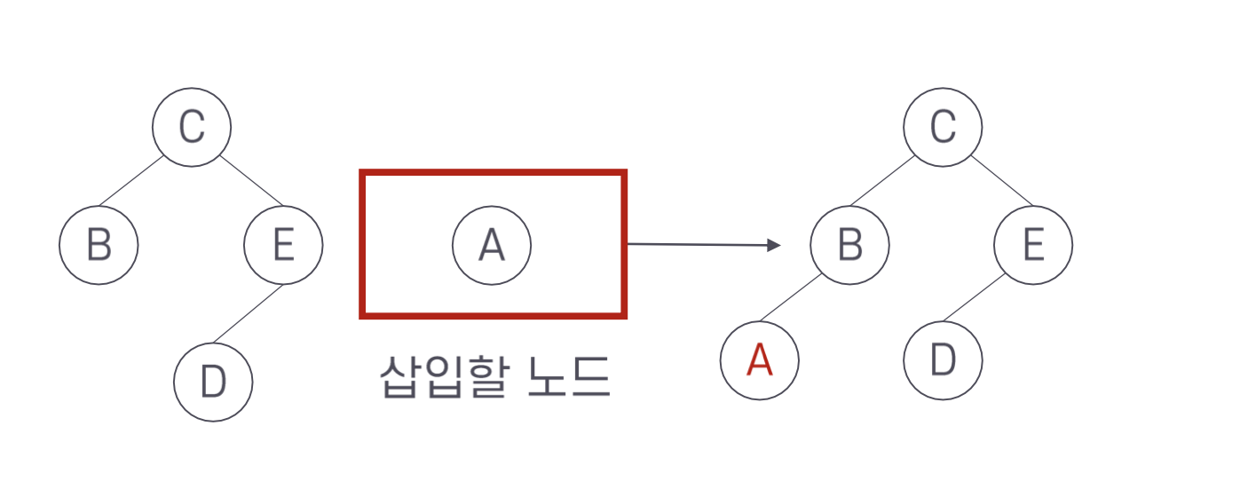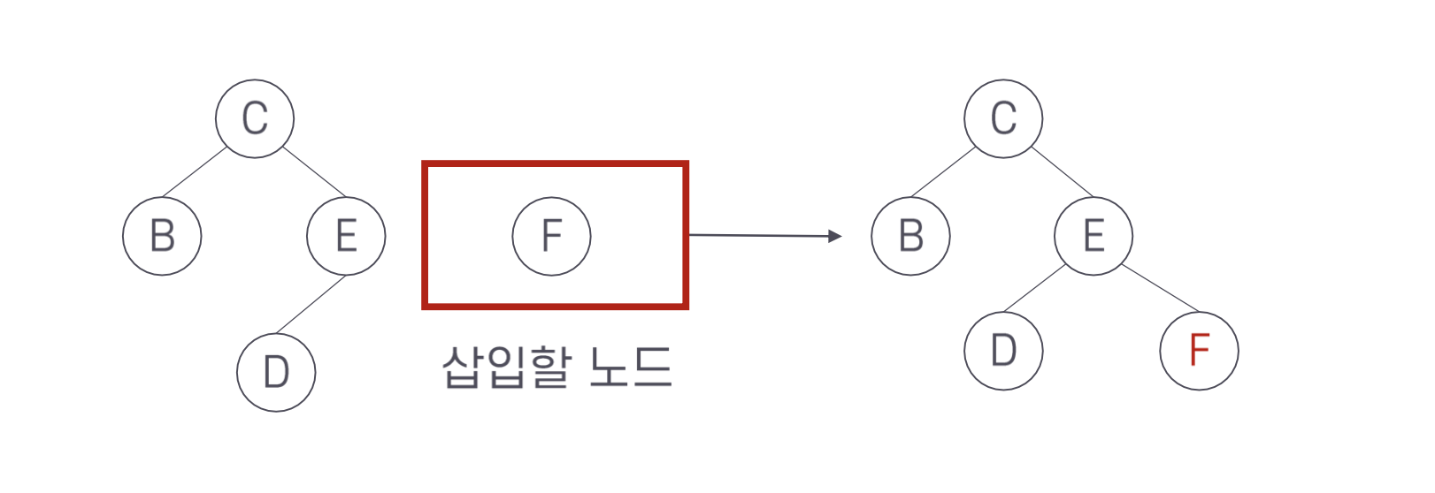 키 A는 C보다 그리고 B 보다 작으므로 왼쪽으로 내려가 잎 노드의 왼족에 삽입한다. 반면에 키 F는 C 보다 그리고 E 보다 크므로 키가 E인 노드의 오른쪽에 삽입하는데 이 노드는 잎은 아니다. 그러나 삽입할 위치인 오른쪽에 자식이 없다. 즉, 오른쪽 자식을 가리키는 포인터가 Null 이다. 따라서 단계 1)에 의해 키 F를 가지는 노드를 삽입한다.