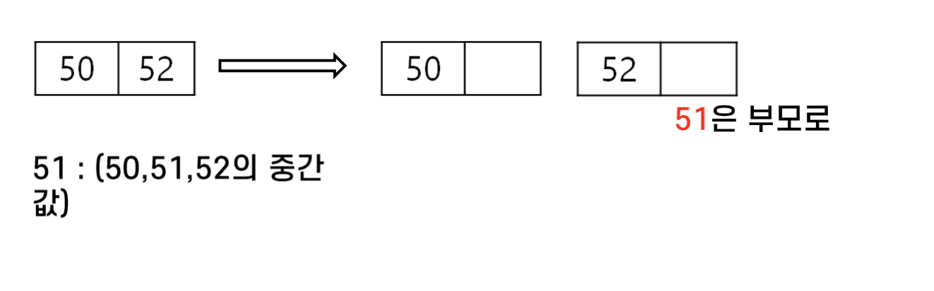 그렇다면 51은 어떠할까? 50과 52 사이에 넣어야 하기 때문에 먼저 노드를 분리해야 한다.