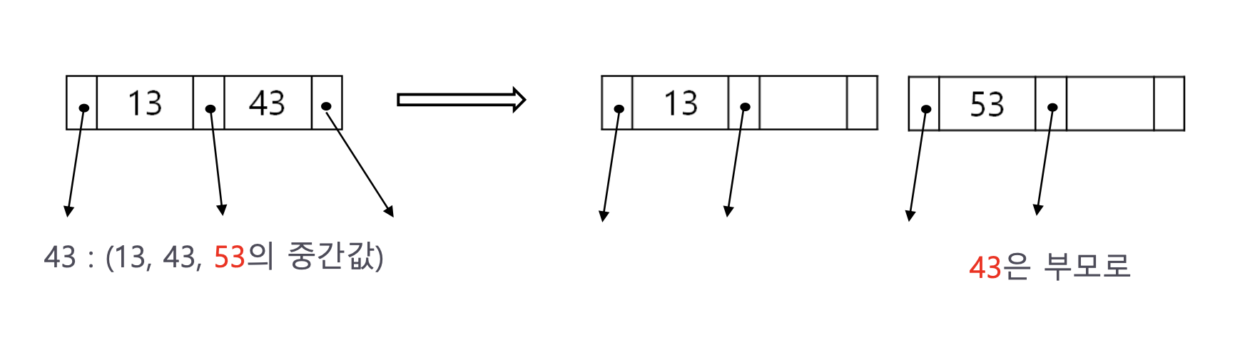 3-3. 중간값을 가지는 노드의 키와 포인터를 부모 노드에 삽입한다. 만일 부모 노드가 루트 노드이면 두 노드를 가리키도록 (자식 노드가 되도록) 수정한다.
