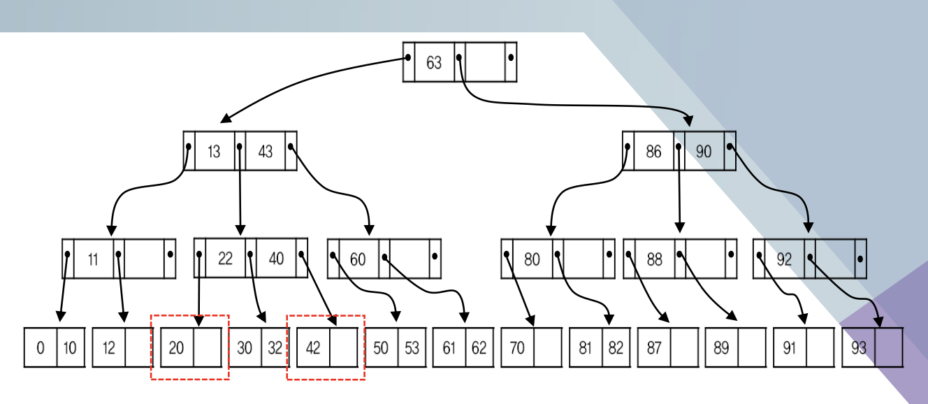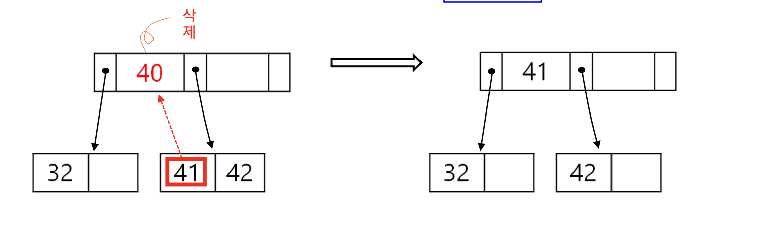 40을 삭제하는 경우, 해당 노드는 잎 노드가 아니고 키값이 하나도 없다. 이 노드에 적당한 키를 끌어다 놓아야 한다. 삭제한 키 오른쪽 포인터가 가리키는 서브트리에서 가장 왼쪽 키를 가져온다.