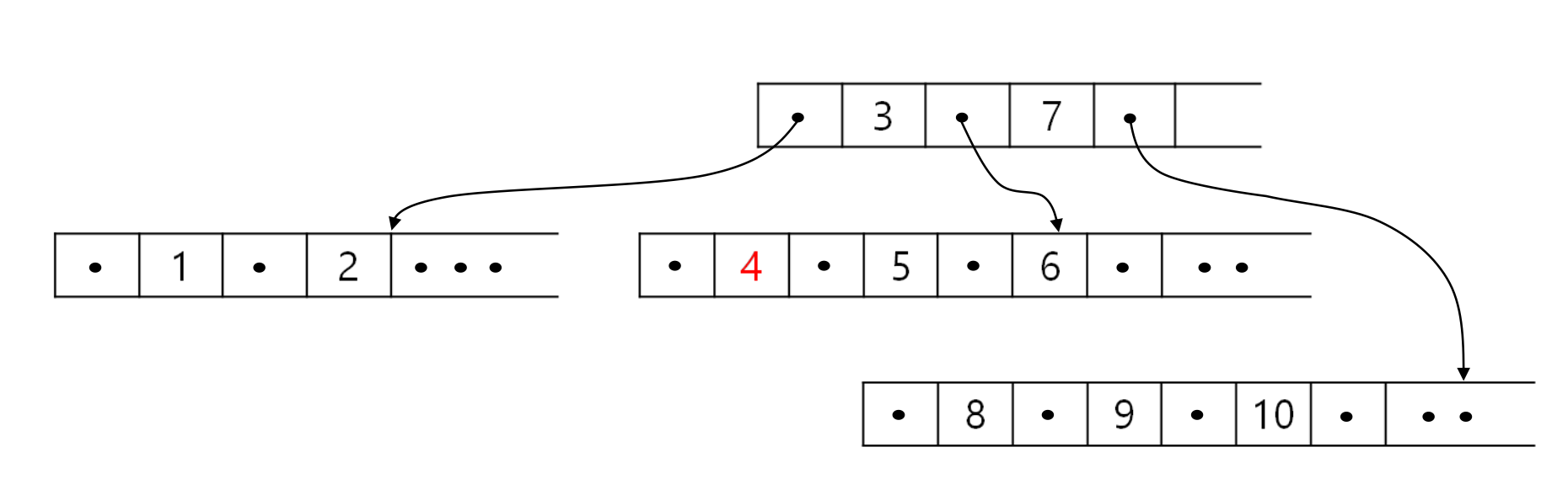 - B+ 트리는 잎의 마지막 포인터가 다음 키값을 갖는 노드를 가리킨다. 따라서 순차 처리를 할 때는 이 포인터를 이용하여 차례로 다음 데이터에 접근해서 처리할 수 있다.