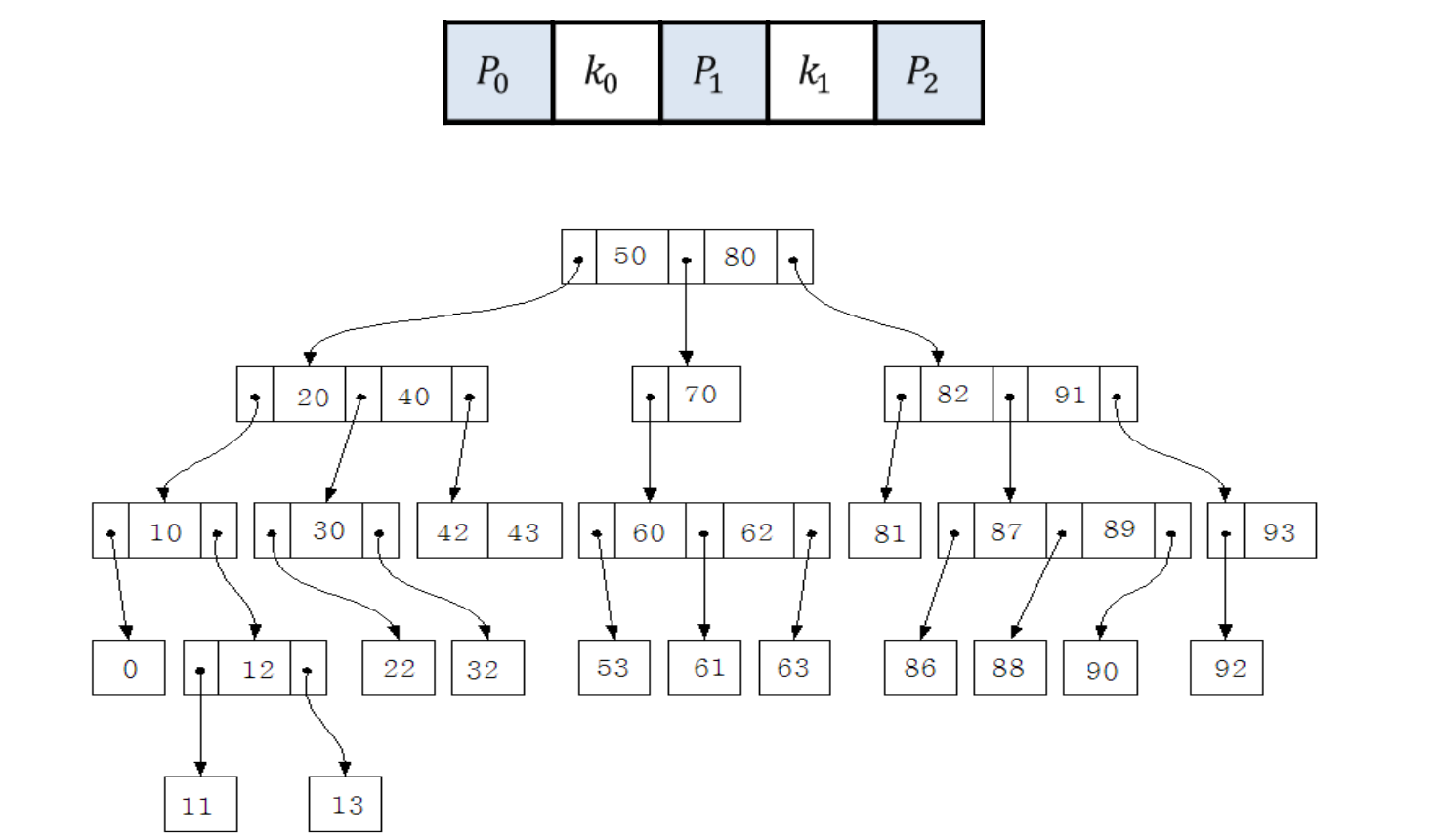 1) 노드 구조는 다음과 같다. 여기서 p0, p1, ..., pn은 서브트리에 대한 포인터이고 k0, ..., kn-1은 키값이다. 또한 n<=m-1이 성립한다.