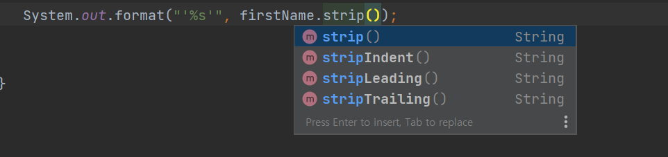 System.out.format("'%s'", firstName.strip());