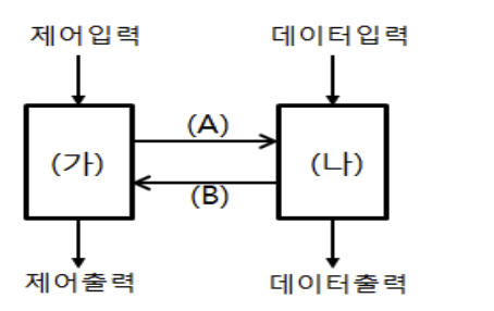 해설: 그림은 컴퓨터의 제어장치와 처리장치 간의 상호작용을 나타낸다. (A)는 '제어신호'로, 제어장치에서 처리장치로 보내는 신호이며, (B)는 '상태신호'로, 처리장치에서 제어장치로 보내는 신호를 의미한다. 이러한 상호작용은 컴퓨터 시스템의 작동을 조율하는 데 중요하다.