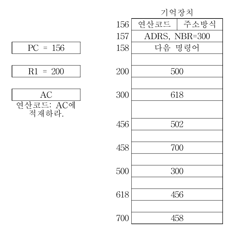 (7~9) 아래 그림은 어느 순간의 기억장치와 PC, 레지스터를 나타내고 있다. PC의 현재 내용이 156이므로 이제 곧 156번지에 있는 컴퓨터 명령어를 수행하게 될 것이다. 컴퓨터 명령어의 연산코드 내용이 해당 피연산자를 AC에 적재하라는 것이고 주 소 필드의 값은 300일 때,다음 물음에 답하라. 단,주소지정방식 이 레지스터를 사용할 경우는 레지스터 이을 사용하는 것으로 가정한다.
