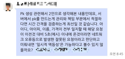 그렇지만 어떤 방식을 써보아도 결국 본질적인 멱등함을 보장하지 않으면 문제는 같았고 결국 최선의 방식으로 위에서 결정한 방식으로 선택했다.