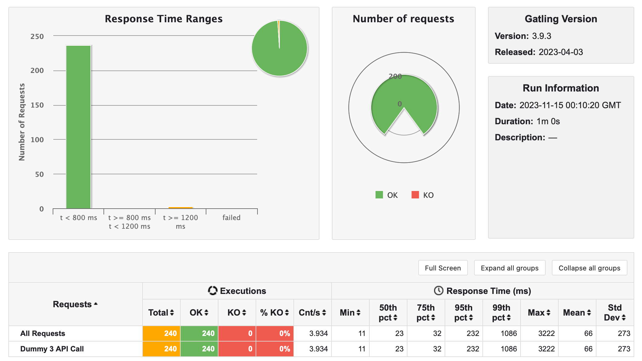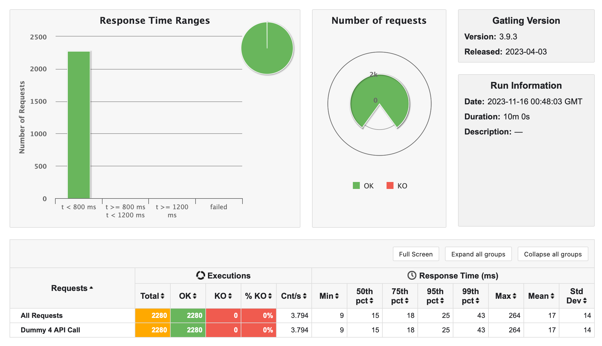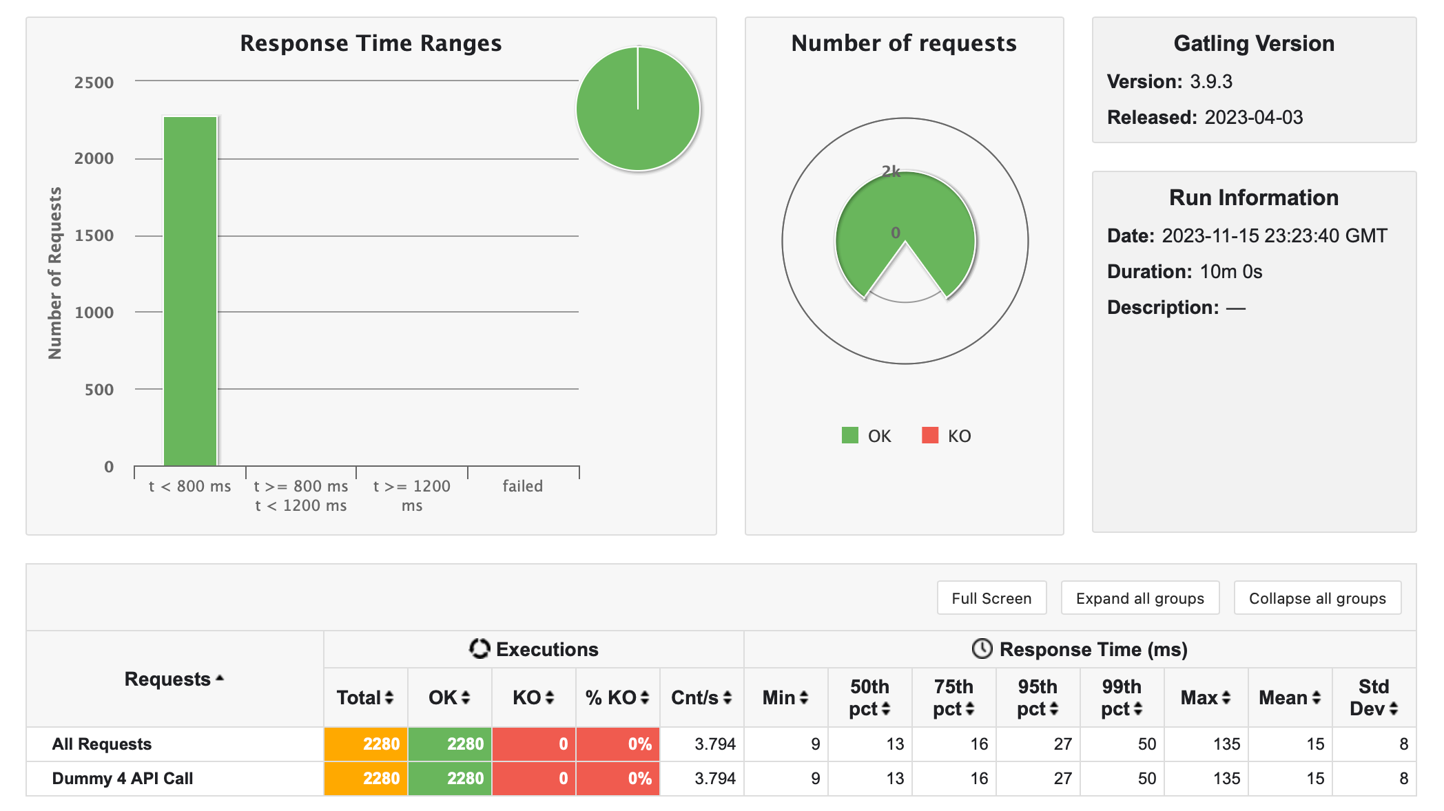 테스트 도구는 Gatling 오픈소스 부하 테스트 프레임워크를 사용했습니다. Gatling은 실제 사용자 상호작용을 모방하는 시뮬레이션을 수행하며, 웹 애플리케이션에 대한 부하를 생성하고 성능을 측정할 수 있어 유저 기반의 요청 응답 성능을 쉽게 측정할 수 있습니다. 또한 결과 리포트를 html 기반의 ui로 제공하여 한눈에 비교 분석이 용이합니다. 가장 큰 장점은 java로 시뮬레이션을 작성할 수 있다는 부분입니다.