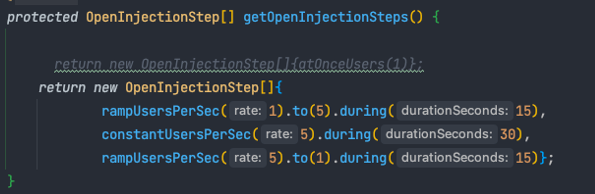 - 동시 사용자 증가 시뮬레이션: 일정 시간 동안 점진적으로 사용자 수를 증가시켜 애플리케이션의 부하 증가를 시뮬레이션합니다. 예를 들어, 1초당 1명의 사용자가 시작하여 5명까지 10초 동안 증가, 이후 40초 동안 5명을 유지하고, 마지막으로 5명에서 1명까지 30초 동안 감소하는 패턴을 사용할 수 있습니다.