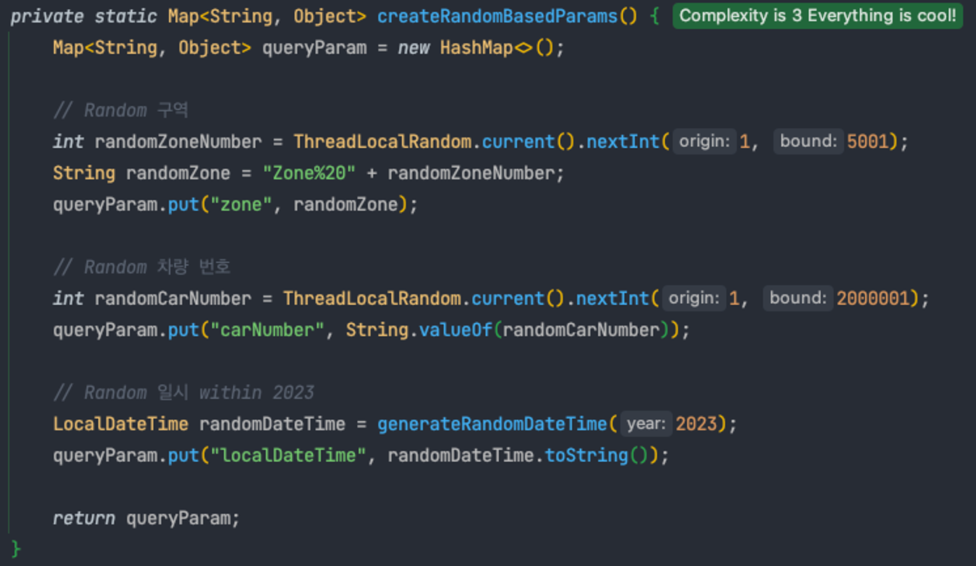 - Java 기반의 테스트 환경: Java 코드로 다양한 시나리오 및 커스텀 쿼리 파라미터 설정을 통해 다양한 테스트 케이스를 구성할 수 있습니다. 본 테스트에서는