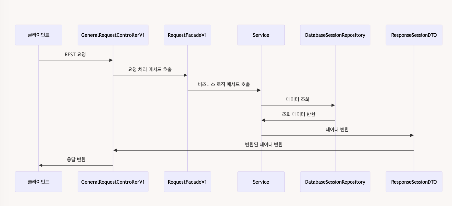 REST요청이GeneralRequestControllerV1클래스에 도착합니다. GeneralRequestControllerV1는 해당 요청을 처리할RequestFacadeV1의 메서드를 호출합니다.RequestFacadeV1은 실제 비즈니스 로직을 처리하는Service의 메서드를 호출합니다.Service는 데이터를 데이터베이스에서 조회하기 위해DatabaseSessionRepository를 사용합니다.- 조회된 데이터는