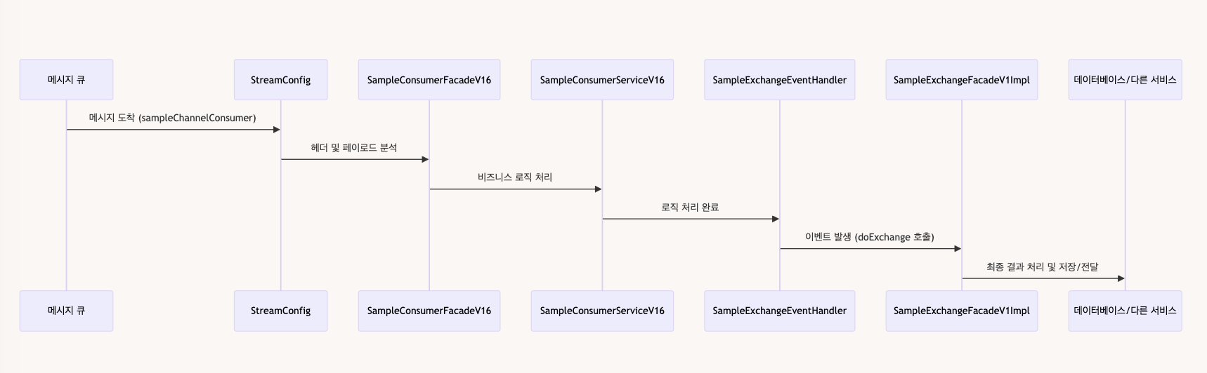 SampleConsumerFacadeV16의 적절한 메서드가 호출됩니다. SampleConsumerFacadeV16는SampleConsumerServiceV16의 메서드를 호출하여 실제 비즈니스 로직을 처리합니다.- 비즈니스 로직 처리가 완료되면,