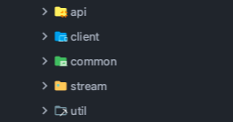 api패키지는 사용자 요청을 받아 처리하는 역할을 담당합니다.client패키지는 외부 서비스에 요청을 보내는 클라이언트 로직을 담당합니다.common패키지는 공통적으로 사용되는 로직과 설정을 관리합니다.stream패키지는 비동기 처리나 스트리밍과 관련된 로직을 담당합니다.util패키지는 공통 유틸리티 기능을 제공합니다.