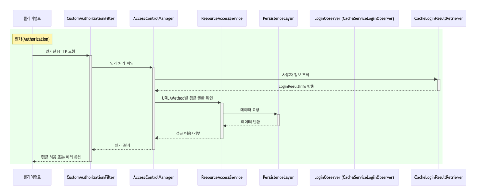 먼저 클라이언트로부터 인가된 HTTP 요청이 들어오면 인가 필터를 통해 요청 처리를 시작합니다. 이 필터는 요청의 URI와 HTTP 메서드, 사용자 ID를 통해 캐시된 사용자 정보를 조회하고, 이 정보를 바탕으로 사용자의 접근 권한을 판단합니다. 사용 판단 케이스는 두 가지로 나뉩니다.