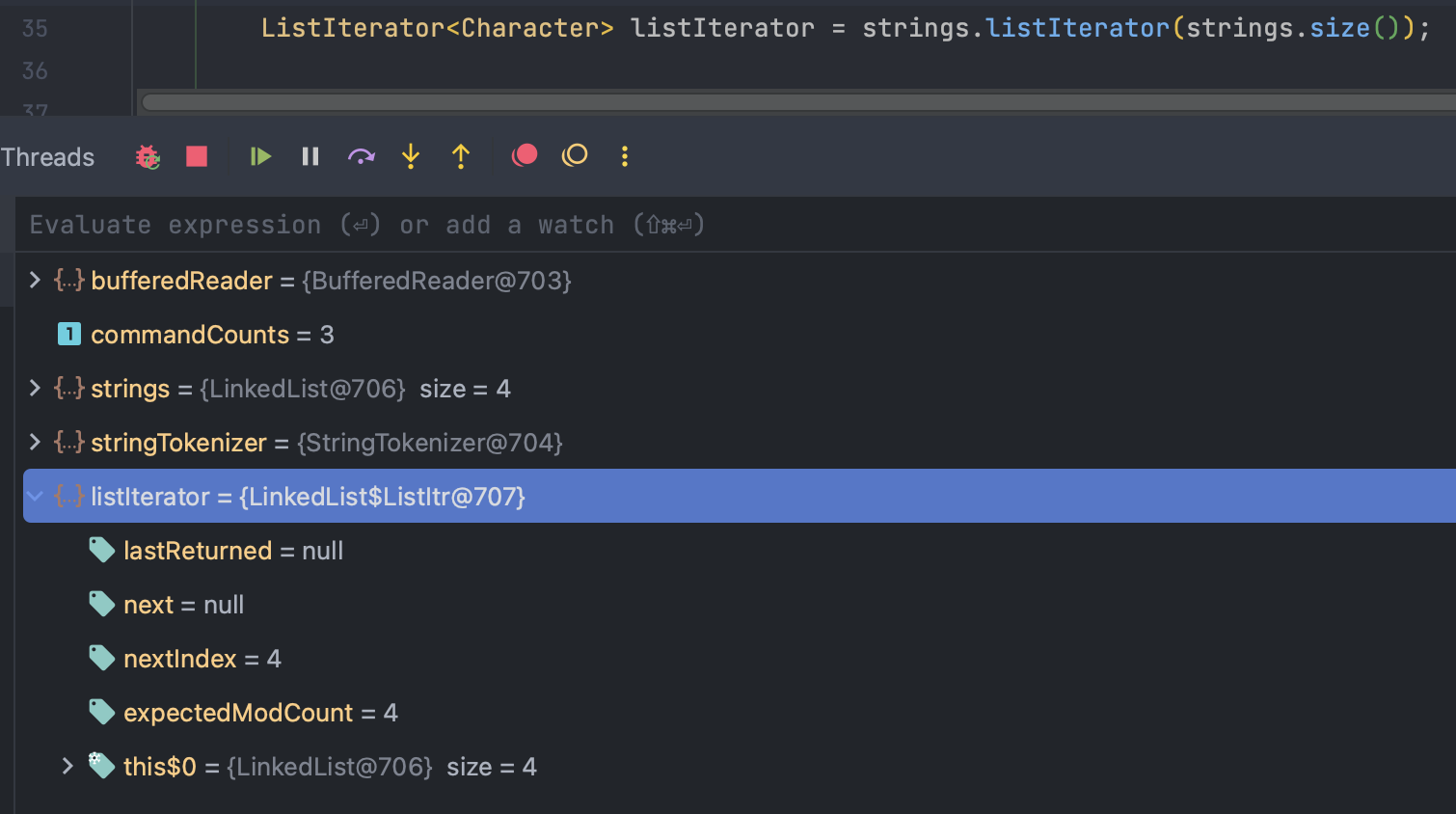 ListIterator<Character> listIterator = strings.listIterator(strings.size());