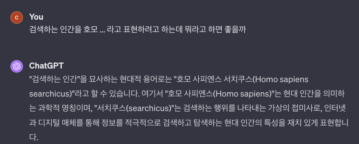 단순히 코드를 주고 받는 짝 프로그래밍은 이제 너무 익숙하다. 아키텍처 패턴, 성능의 좋고 나쁨, 유지보수성 등등 개발 관련된 모든 것들 중에 조금이라도 궁금한 게 생긴다거나 긴가민가 한게 있으면 일단 GPT와 대화를 나누면서 답을 찾는다. 매일 뭔가를 물어본다. GPT는 왠만하면 답을 잘하는데, 질문을 잘할 수록 답변 퀄리티가 말도 못하게 상승한다. 그래서 질문을 잘하려고 노력한다. 보다 적절한 질문을 하기 위해서 인터넷을 뒤지기도 한다. 뭔가 앞 뒤가 바뀐 것 같다. 이전에는 원하는 것을 찾기 위해서 검색을 할 텐데, 이제는 질문을 제대로 하기 위해서 검색을 한다. 나는 검색하는 인간 호모 서치쿠스의 시대가 저물고 있다는 것에 동의한다. 최소한 저무는 것은 아니더라도 다른 형태로 진화하고 있는 것 같다. 사실 방금 쓴 호모 서치쿠스라는 용어도 GPT 선질문 후검색으로 사용한 단어이다.