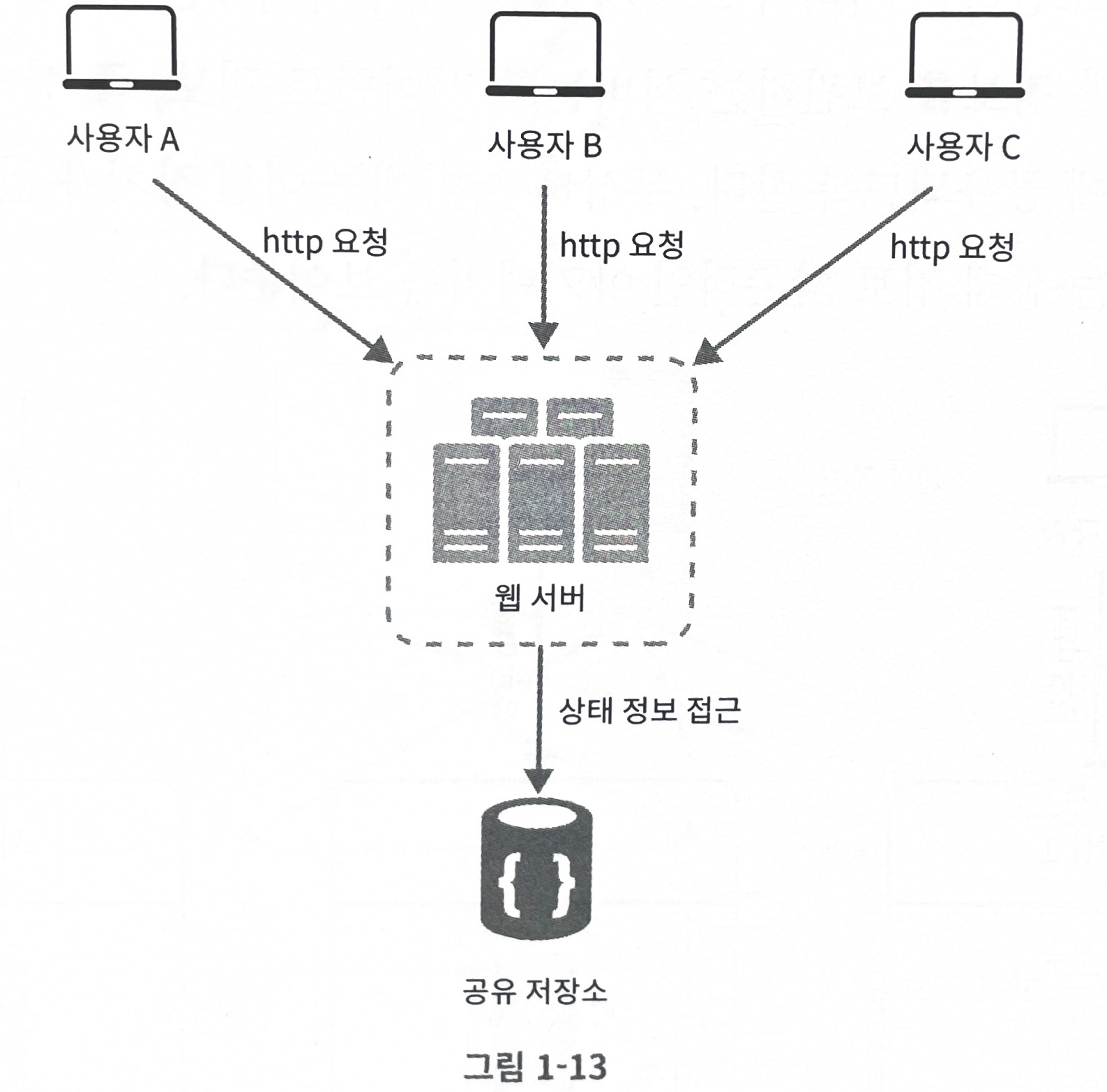 이 구조에서 사용자로부터의 HTTP 요청은 어떤 웹 서버로도 전달될 수 있다. 웹 서버는 상태 정보가 필요할 경우 공유 저장소로부터 데이터를 가져온다. 따라서 상태 정보는 웹 서버로부터 물리적으로 분리되어 있다. 이런 구조는 단순하고, 안정적이며, 규모 확장이 쉽다.