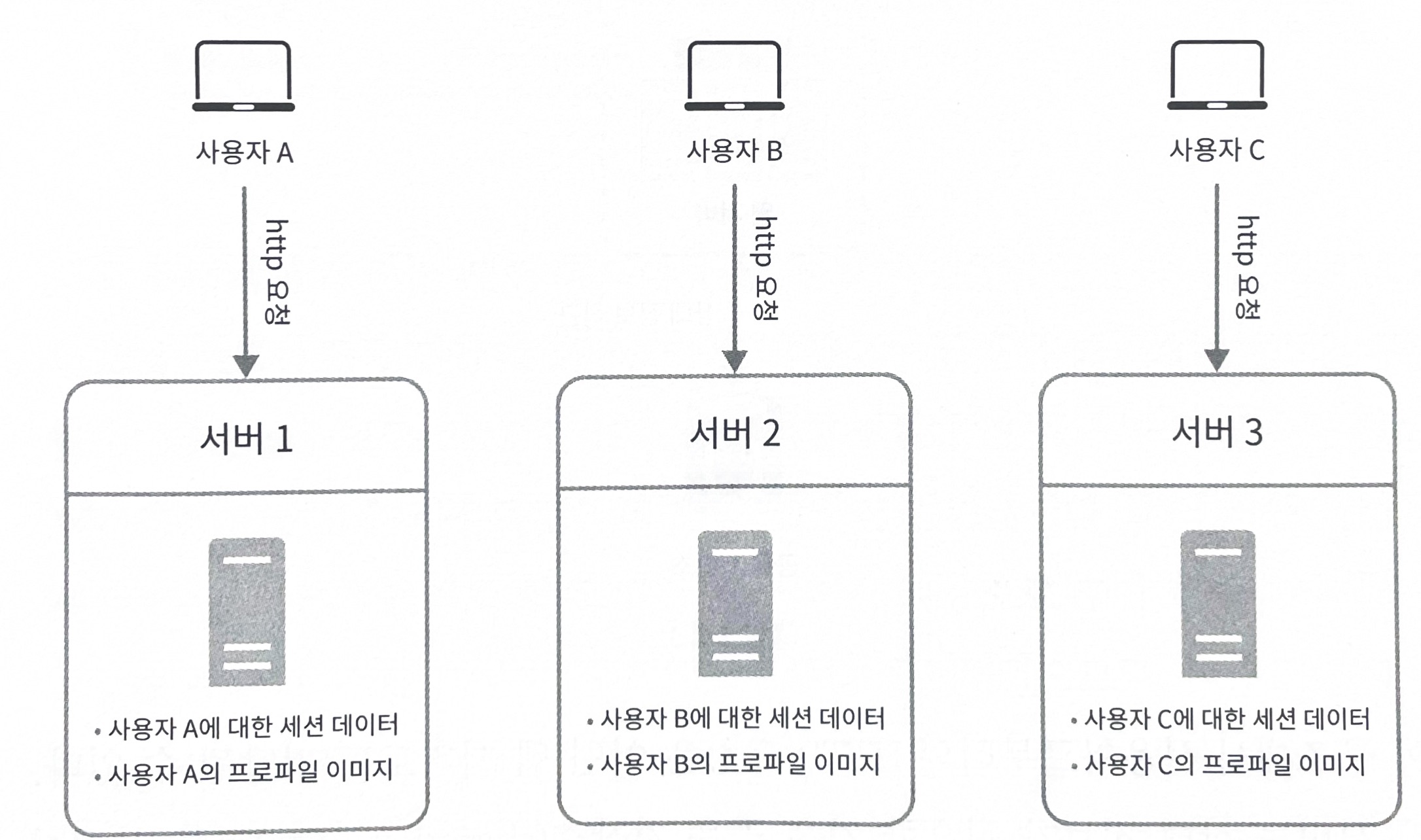 사용자 A의 세션 정보나 프로파일 이미지 같은 상태 정보는 서버 1에 저장된다. 사용자 A를 인증하기 위해 HTTP 요청은 반드시 서버 1로 전송되어야 한다. 요청이 서버 2로 저장되면 인증은 실패할 것인데, 서버 2에 사용자 A에 관한 데이터는 보관되어 있지 않기 때문이다.