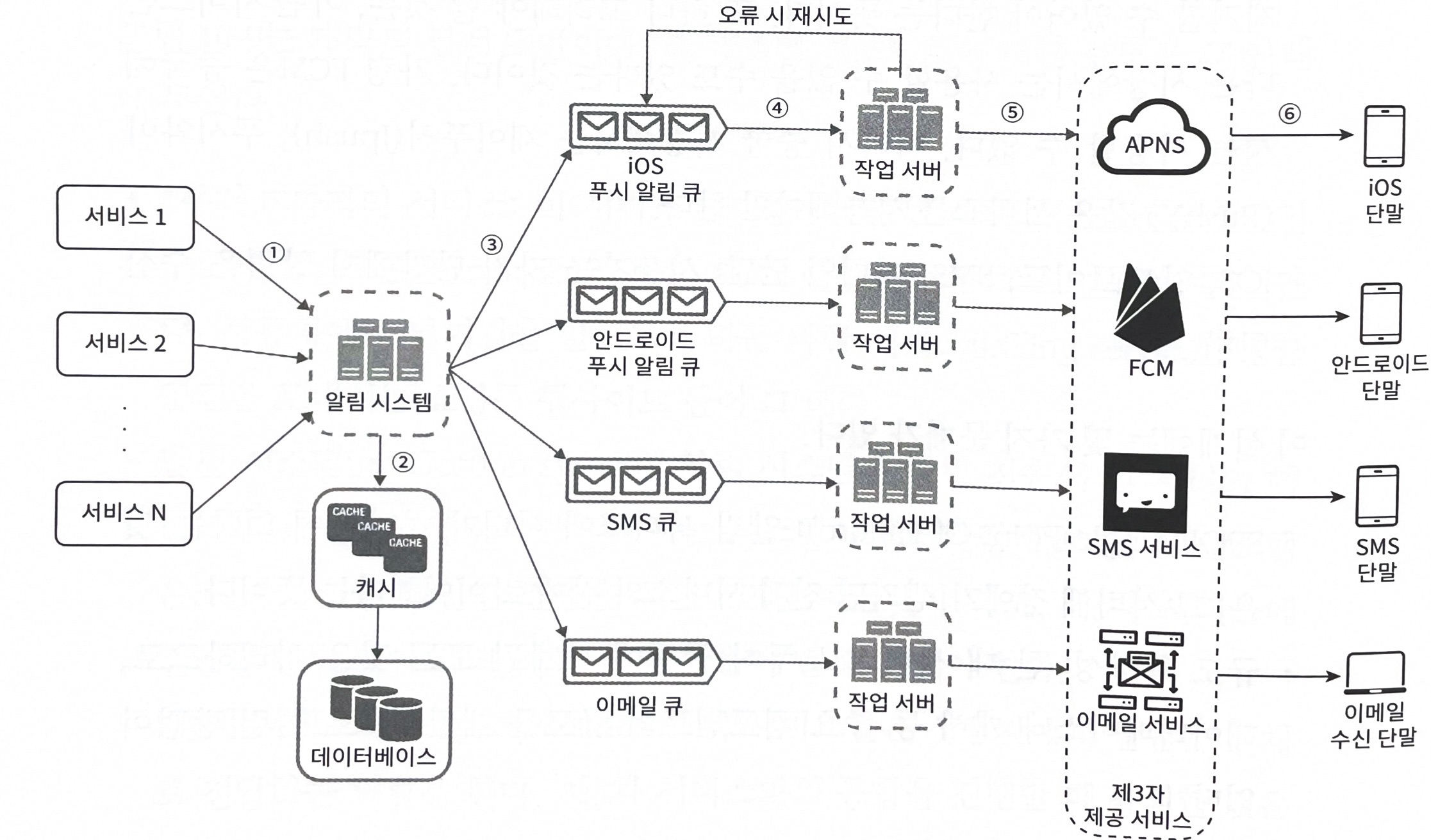 알림 서비스: 특정 이벤트가 발생했음을 클라이언트에게 알리는데 쓰이는 발생/구독 프로토콜 기반 시스템이다. 예시 설계안의 경우에는 클라이언트에게 파일이 추가되었거나, 편집되었거나, 삭제되었음을 알려, 파일의 최신 상태를 확인하도록 하는 데 쓰인다.