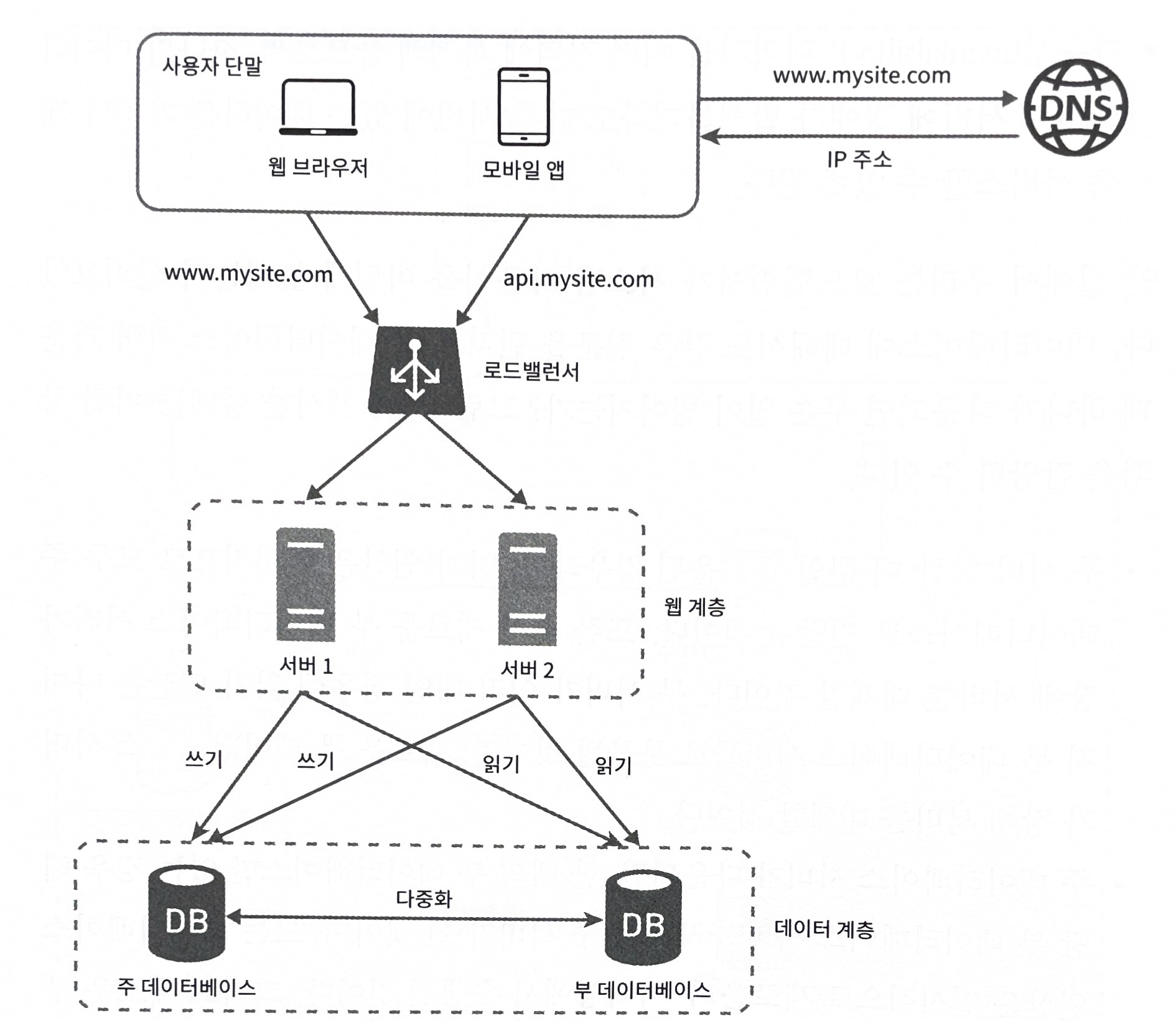 - 웹사이트로 유입되는 트래픽이 가파르게 증가하면 두 대의 서버로 트래픽을 감당할 수 없는 시점이 오는데, 로드밸런서가 있으므로 우아하게 대처할 수 있다. 웹 서버 계층에 더 많은 서버를 추가하기만 하면 된다. 그러면 로드밸런서가 자동적으로 트래픽을 분산하기 시작할 것이다.