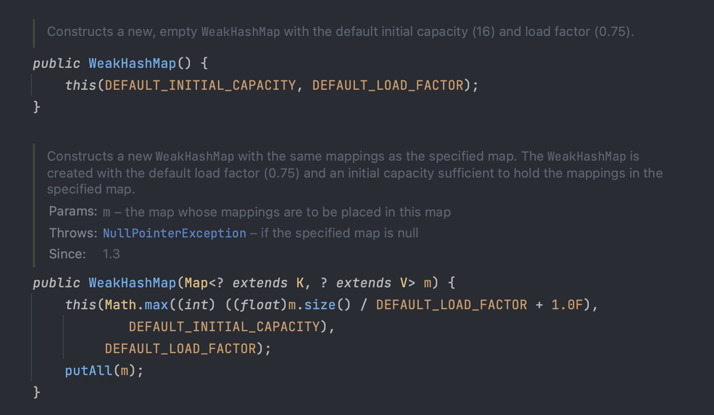 WeakHashMap에 작성된 공식 자바독을 보면 WeakHashMap은 키에 대한 약한 참조(Weak Reference)를 사용하는 Map 구현체입니다. 이는 WeakHashMap에 저장된 키가 다른 곳에서 더 이상 사용되지 않고 GC에 의해 회수될 수 있다면, 자동으로 해당 키와 관련된 엔트리를 맵에서 제거할 수 있도록 설계되었습니다. 이러한 특성 덕분에, 명시적으로 키를 제거하는 로직 없이도 메모리 누수를 방지할 수 있습니다.