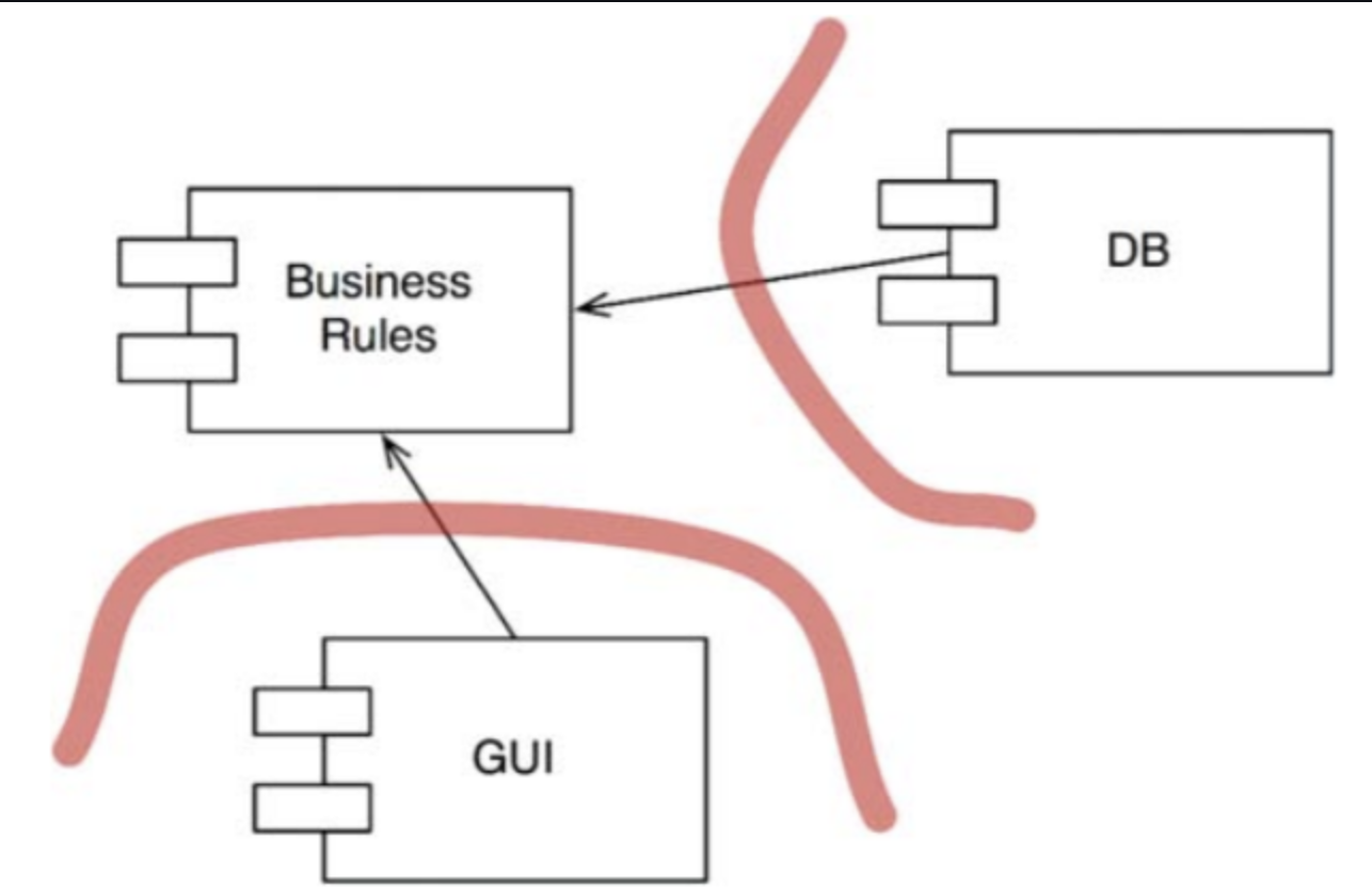 소프트웨어 아키텍처에서 경계선을 그리려면 먼저 시스템을 컴포넌트 단위로 분할해야 한다. 일부 컴포넌트는 핵심 업무 규칙에 해당한다. 나머지 컴포넌트는 플러그인으로, 핵심업무와는 직접적인 관련이 없지만 필수 기능을 포함한다. 그런 다음 컴포넌트 사이의 화살표가 특정 방향, 즉 핵심 업무를 향하도록 이들 컴포넌트의 소스를 배치한다. 이는 의존성 역전 원칙과 안정된 추상화 원칙을 응용한 것임을 눈치챌 수 있어야 한다. 의존성 화살표는 저수준 세부사항에서 고수준의 추상화를 향하도록 배치된다.