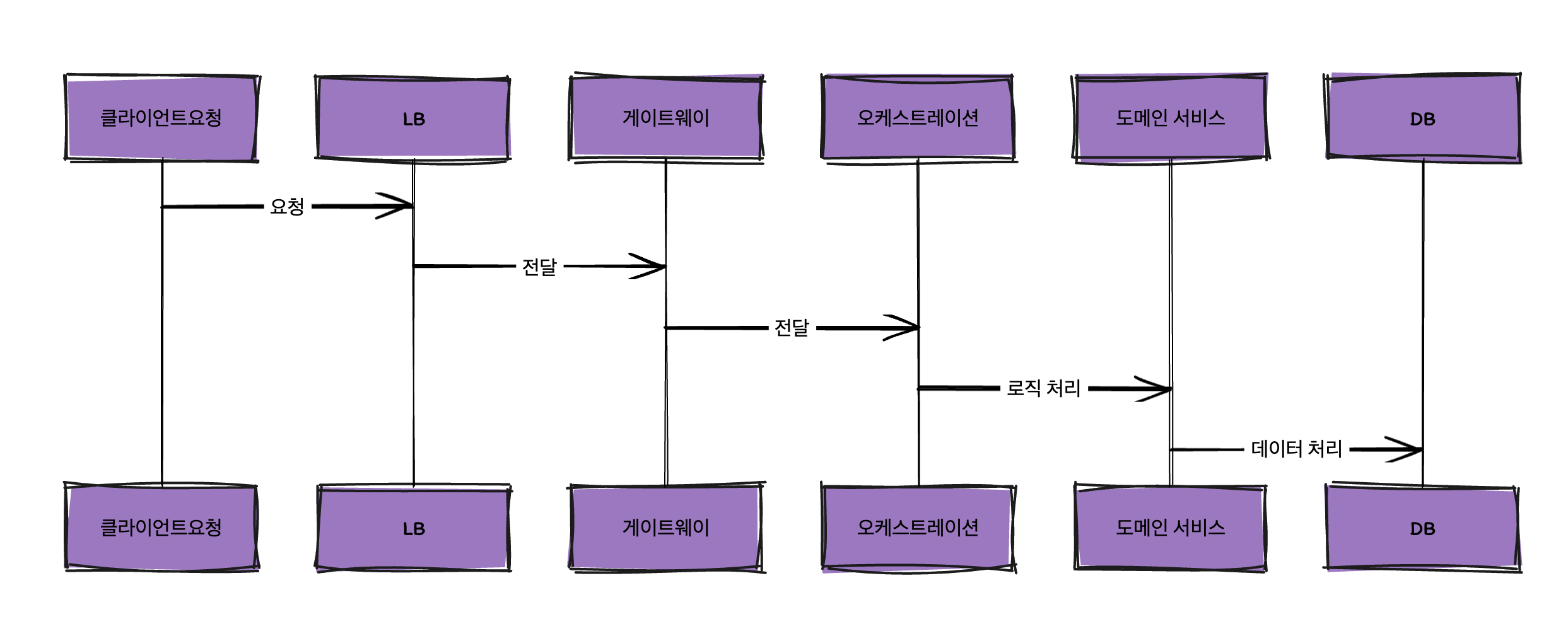 클라이언트요청 -> LB -> 게이트웨이 -> 오케스트레이션 -> 도메인 서비스 - DB