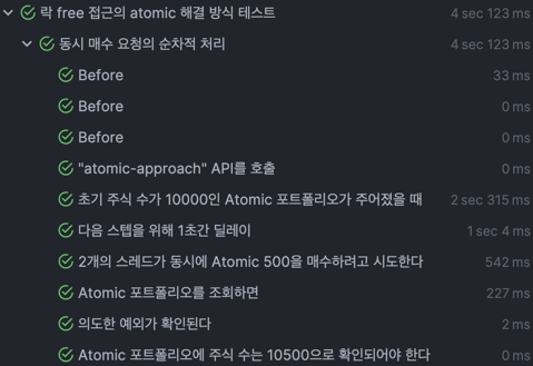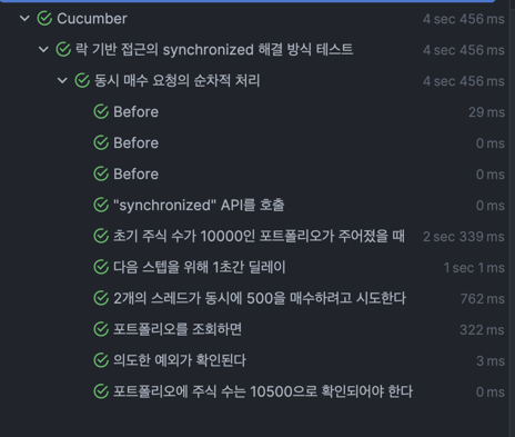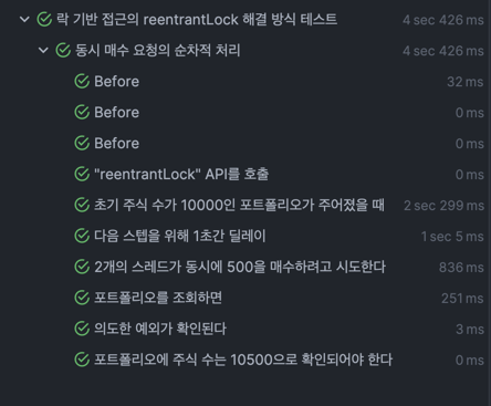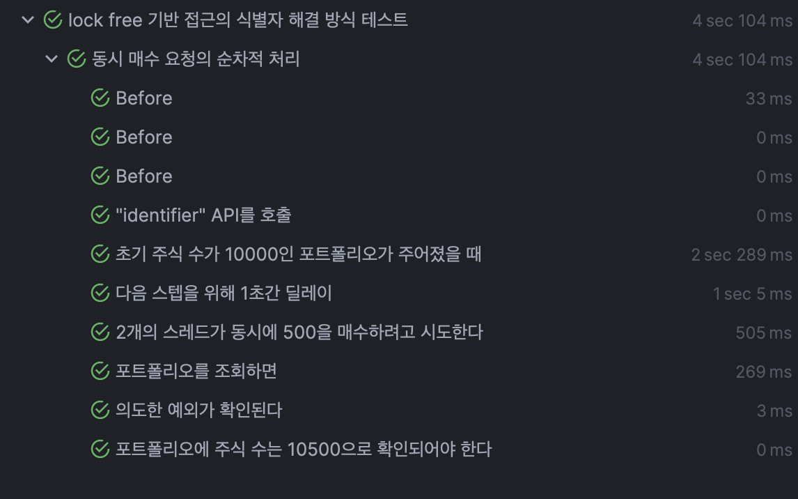 이 접근 방식의 핵심은 각 요청에 고유 식별자를 할당하고, 식별자에 기반한 락을 사용하여 동시 요청을 안전하게 처리하는 것이었다. 마찬가지로 2개의 스레드가 동시에 500주의 주식을 매수하려고 시도한다.