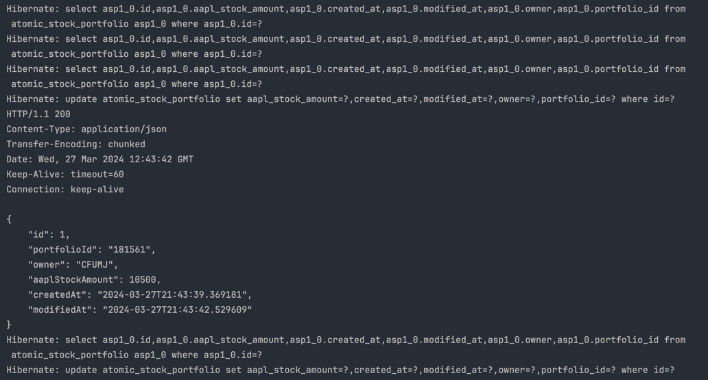 - 첫 번째 요청 처리: 첫 번째 요청이 식별자에 따라 락을 성공적으로 획득하고, 주식 매수 작업을 진행한다. 이 작업이 완료되면, 포트폴리오의 주식 수는 10500주로 업데이트된다.